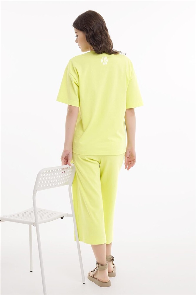 Футболка для дома и отдыха из хлопкового трикотажного полотна прямого кроя. Округлая горловина с обтачкой. Короткий рукав со спущенный линией плеча, по низу рукава термонаклейка силикон. Спереди и на спинке принт.