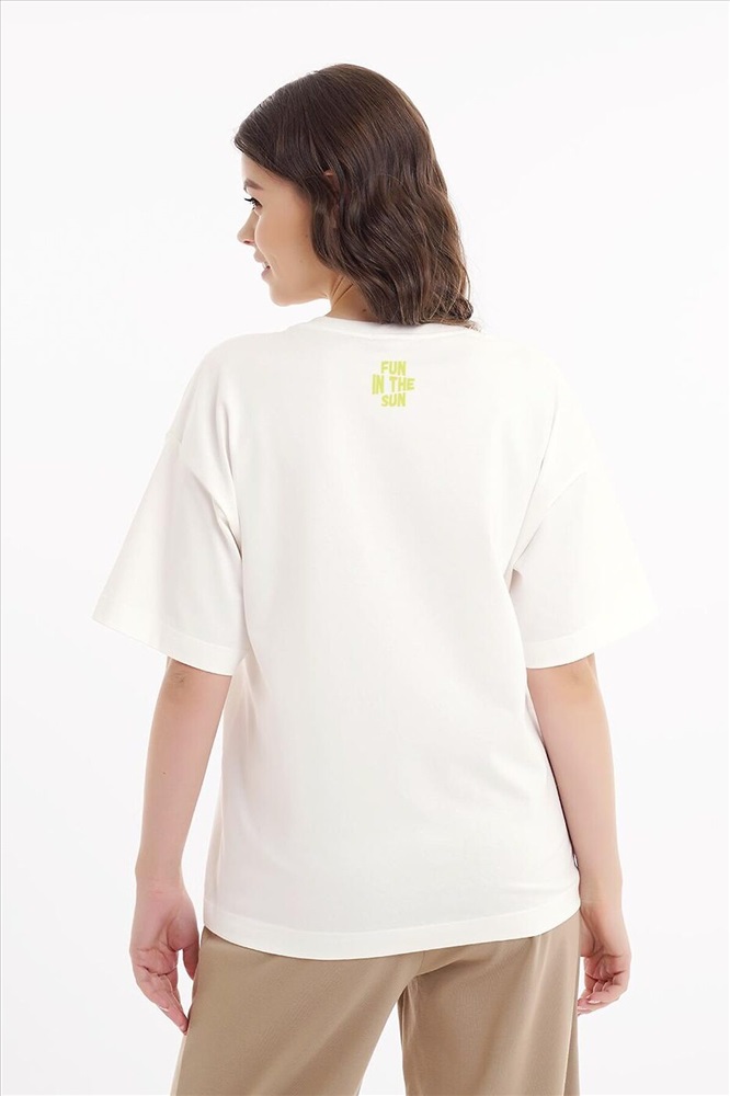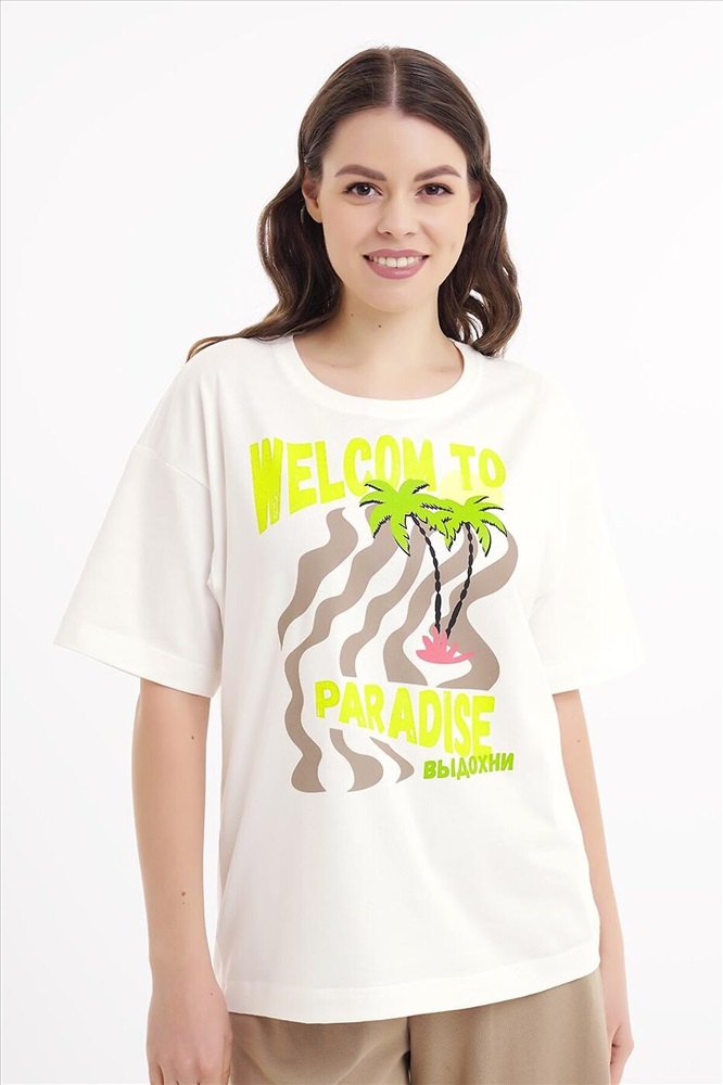 Футболка для дома и отдыха из хлопкового трикотажного полотна прямого кроя. Округлая горловина с обтачкой. Короткий рукав со спущенный линией плеча, по низу рукава термонаклейка силикон. Спереди и на спинке принт.