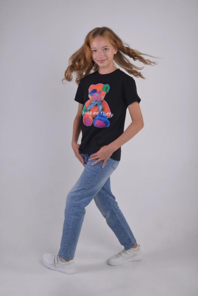 Футболка для девочки подростка черного цвета, свободного классического кроя, классической длины, модная, стильная, нарядная, озорная из мягкого хлопкового полотна 170 г/м2 с трендовым стильным принтом трансфер принт - технологией нанесения картинки на изделие с использованием высоких температур. Яркий трендовый принт поможет создать стильный модный образ, на который обязательно обратят внимание сверстники, что поможет быть в центре внимания и подчеркнет уникальный вкус и выбор модной девчонки. Модель - 11 лет, рост 158 см, размер футболки на девочке - 158-164 см