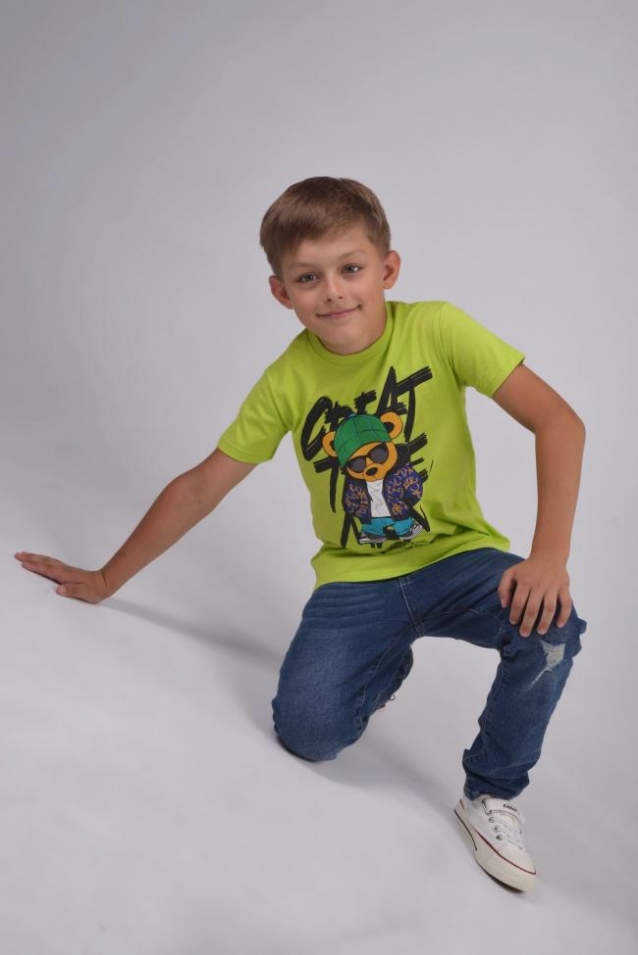 Футболка для мальчика подростка яркого салатового цвета, свободного классического кроя, классической длины, модная, стильная, нарядная, из качественного мягкого хлопкового полотна 170 г/м2 с принтом, выполненным в технологии вотер принт - нанесение рисунка безопасными сертифицированными красителями на водной основе, что позволяет изделию оставаться мягким, тонким и эластичным, долго сохранять яркость. Модная футболка с ярким рисунком в стиле граффити - выбор современных подростков и мальчика-модели на фотосессии. Модель - 9 лет, рост 137 см, размер футболки на мальчике - 134-140 см