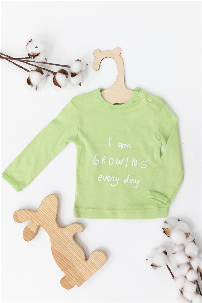 Цвет Номенклатуры: фисташковый Футболка с длинным рукавом выполнена из хлопкового полотна. С застёжкой на кнопки на плече и принтом спереди.