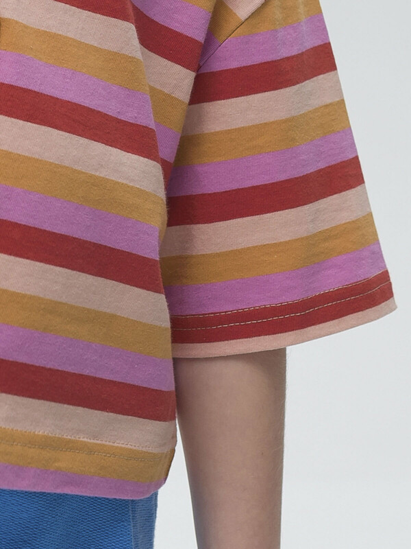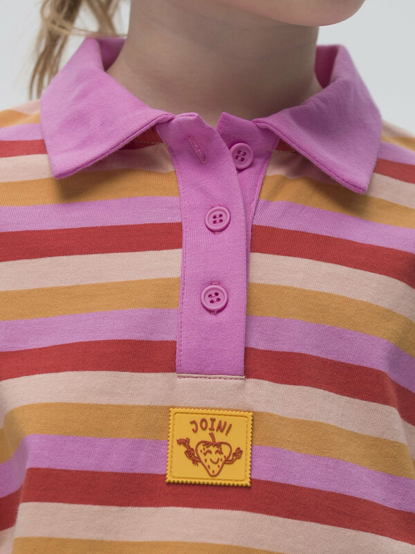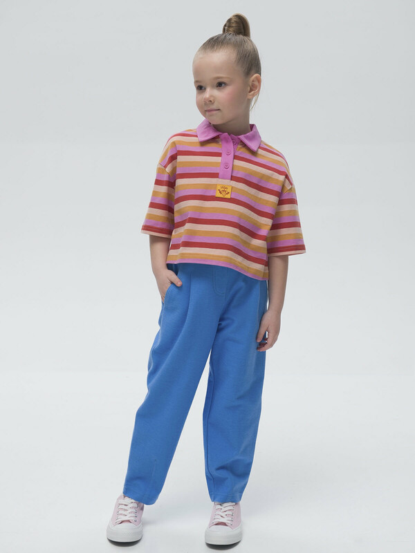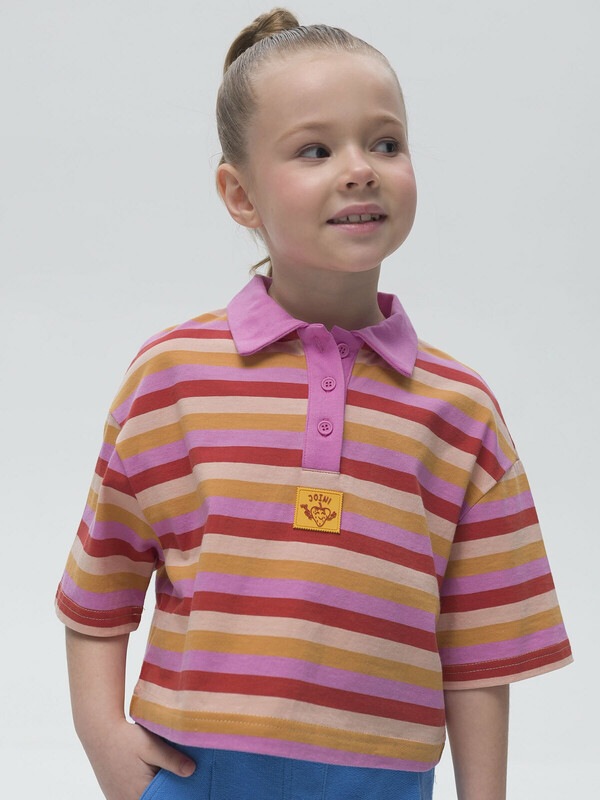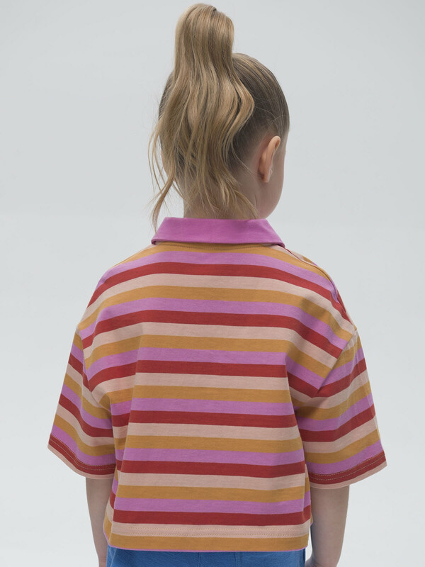 Кроп-топ (поло) оверсайз-силуэта для девочки. Кроп-топ — один из актуальных летних трендов. Модель со спущенным плечом и удлинённым рукавом выполнена из трикотажного полотна в яркую вытканную горизонтальную полоску. Это не принт, полоски не поблёкнут от многочисленных стирок. Состав ткани — хлопок 100%. Благодаря этому поло мягкое, комфортное и приятное на ощупь. Практичный оверсайз-силуэт позволит носить топ продолжительное время. Даже если ребёнок заметно подрастёт, он не станет малым. Модель украшена симпатичной и приятной на ощупь резиновой нашивкой под планкой с пуговицами. Кроп-поло отлично сочетается с шортами и леггинсами.