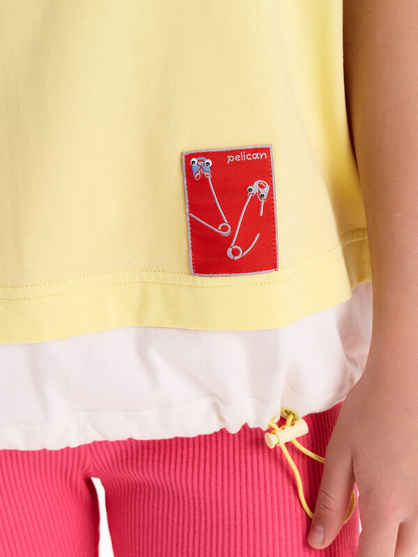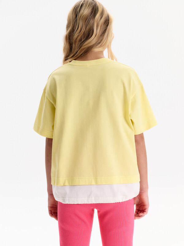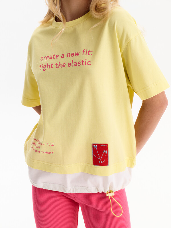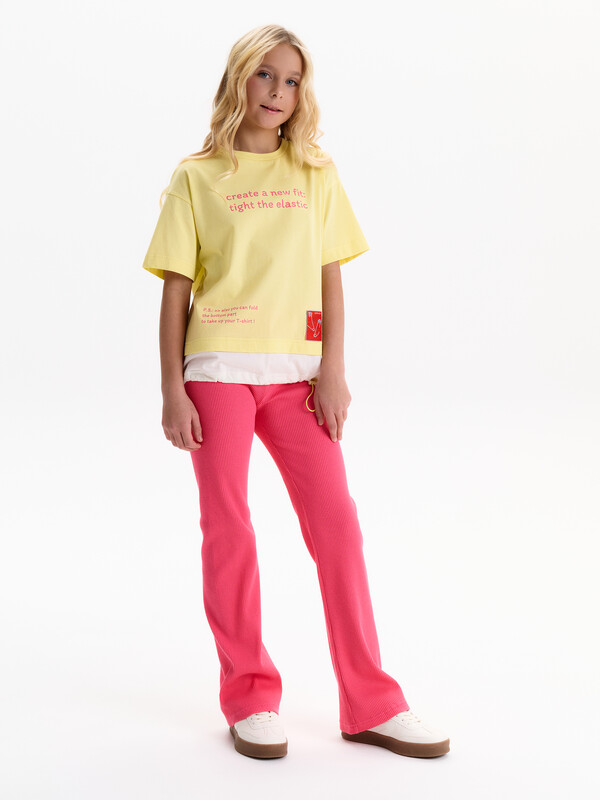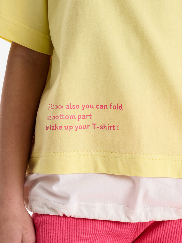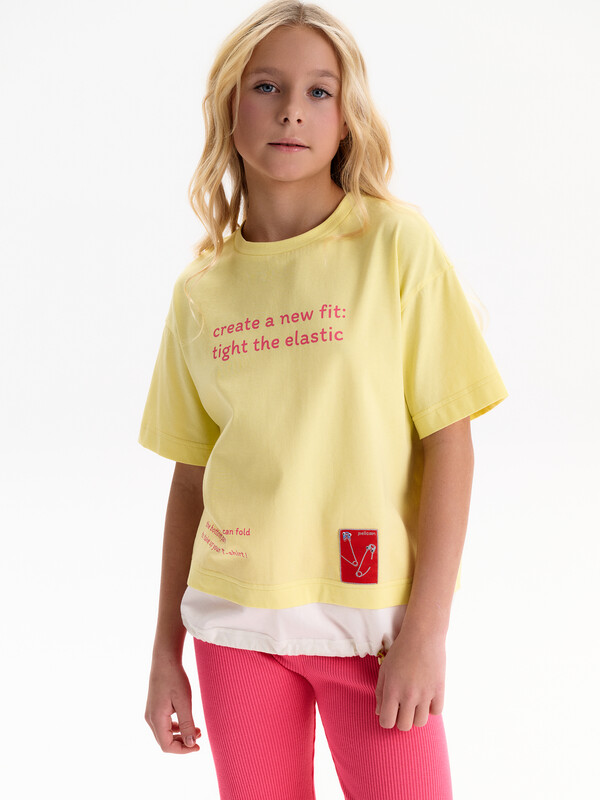 Состав: 100%хлопок Футболка-трансформер для девочки oversize. Модель свободного кроя, средней длины. Выполнена из 100% хлопка. Плечо спущено, посадка комфортная. Эластичная рибана на вырезе горловины гарантирует, что футболка будет легко надеваться и сниматься, не теряя при этом своей формы. Главная особенность — низ-трансформер: конструкция создаёт эффект, будто поверх надета вторая футболка. Внутри по низу — утяжка со стоппером: при затяжке нижняя часть заправляется внутрь, и модель выглядит как укороченная однослойная футболка. Перевод: потяни и создай новый силуэт! Также ты можешь подогнуть низ чтобы укоротить топ! Комментарии к товару