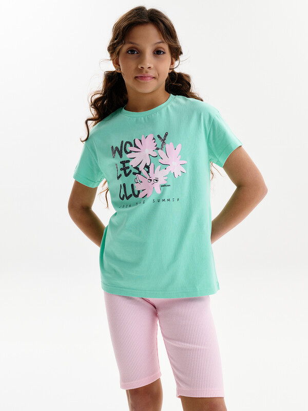Футболка для девочки маленького объема. Выполнена из 100% хлопка. Эластичная рибана на вырезе горловины гарантирует, что футболка будет легко надеваться и сниматься, не теряя при этом своей формы. В принте глиттер разных цветов. Перевод: клуб «Беспокойтесь меньше»; присоединяйтесь к лету.