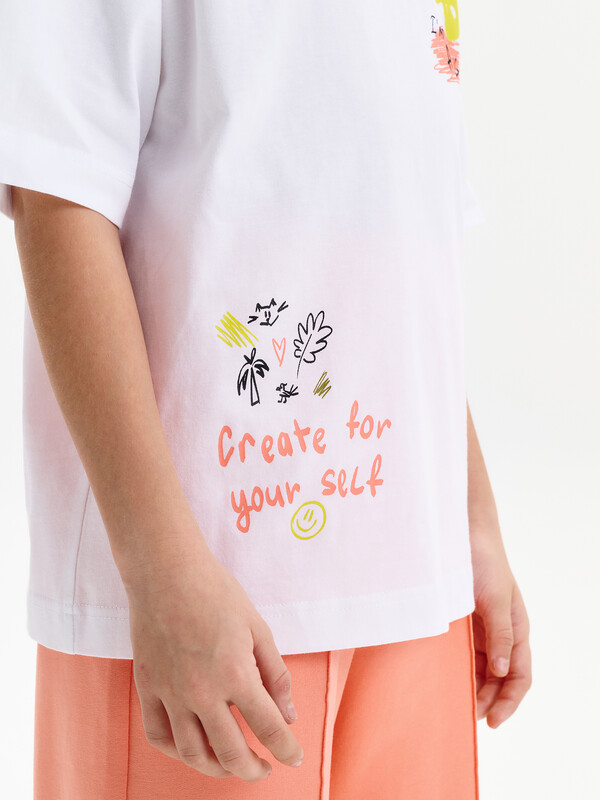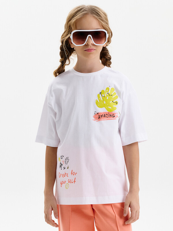 Футболка для девочки умеренного объема. Выполнена из 100% хлопка. Эластичная рибана на вырезе горловины гарантирует, что футболка будет легко надеваться и сниматься, не теряя при этом своей формы. Перевод спереди: Я УДИВИТЕЛЬНАЯ; ТВОРИ ДЛЯ СЕБЯ. Перевод на спинке: МНЕ НРАВИТСЯ ВЕСЬ СПЕКТР ЭМОЦИЙ; И Я ЛЮБЛЮ ОБНИМАШКИ; НИКОГДА НЕ ИЗВИНЯЙСЯ ЗА ТО ЧТО ТЫ ЭТО ТЫ.