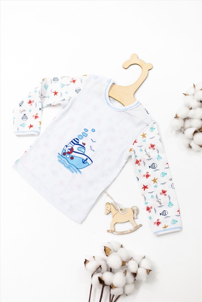 Футболка с длинным рукавом выполнена из 100% хлопковой ткани. Спереди нанесён принт. Благодаря застёжке на кнопки на плече обеспечивается удобство использования изделия и малыш не будет капризничать при одевании.