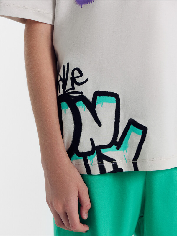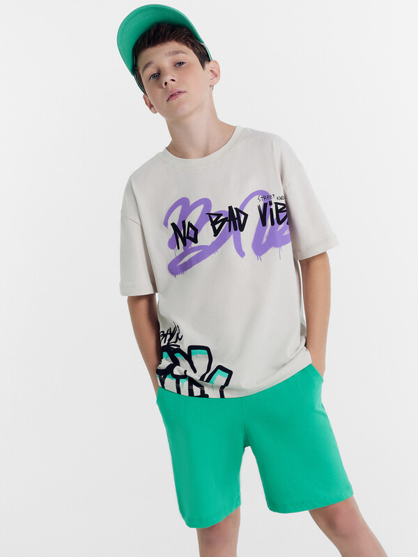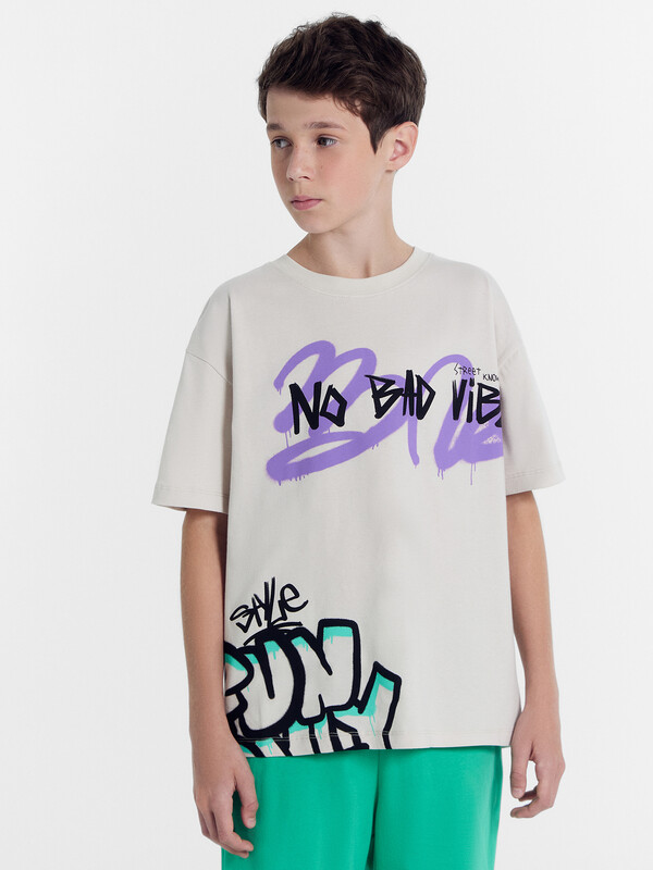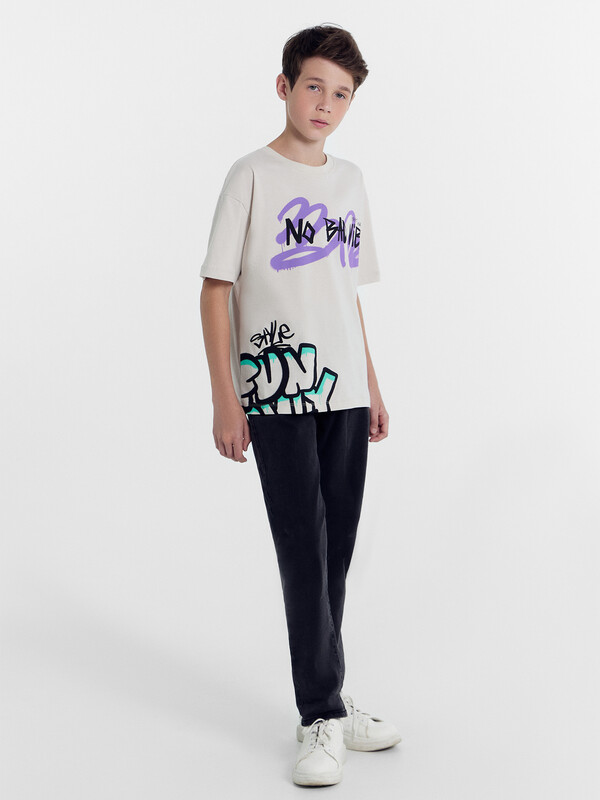 Футболка свободного силуэта из хлопковой трикотажной кулирки. Длина до середины бедер. Рукава короткие. Горловина круглой формы, с обтачкой из рибаны. Спущенная линия плеча дарит особый комфорт. Стильно и удобно!