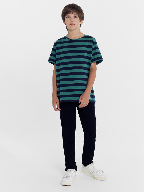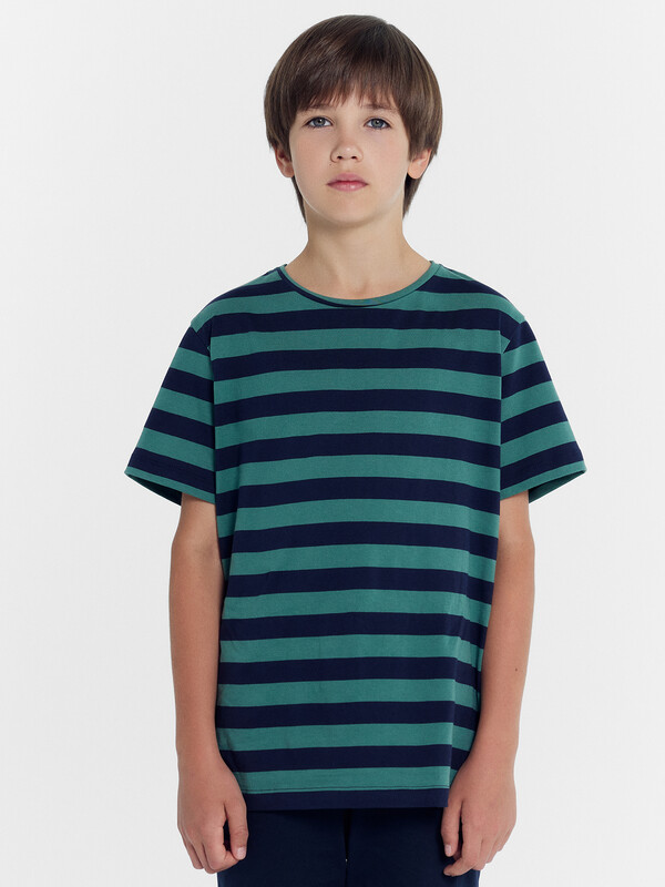 Футболка прямого силуэта. Перед и спинка цельнокроеные. Рукава втачные короткие. Горловина круглой формы, обтачка из основного полотна. Шов притачивания обтачки закрыт бейкой из основного полотна. Низ изделия и рукавов обработаны на 2-х игольной плоскошовной машине швом в подгибку.