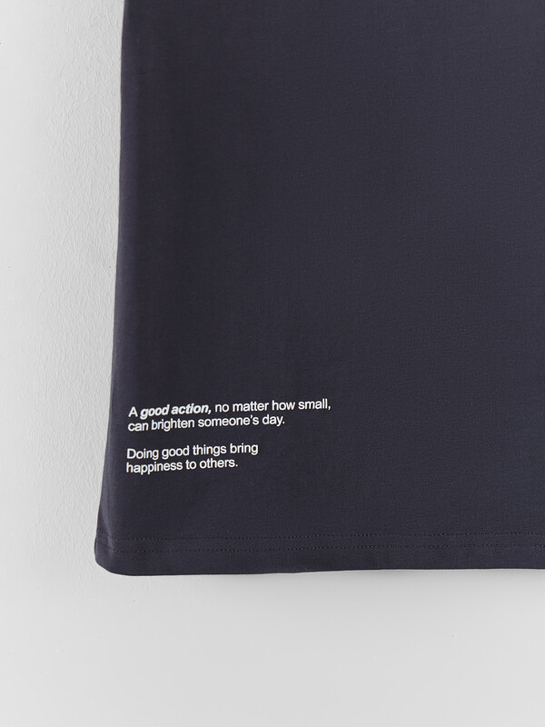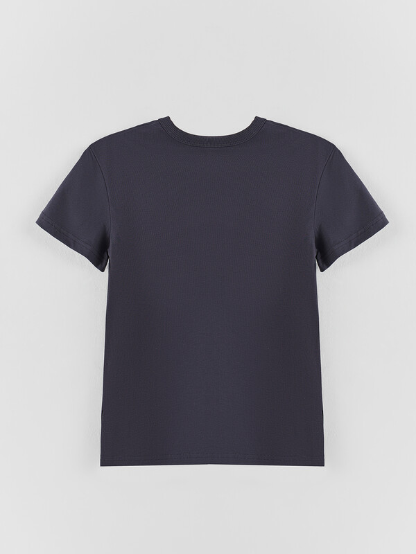 Длина до середины бедра. Рукав втачной, короткий. Горловина круглой формы. Окантована бейкой из рибаны. Низ рукавов и футболки швом в подгибку.
