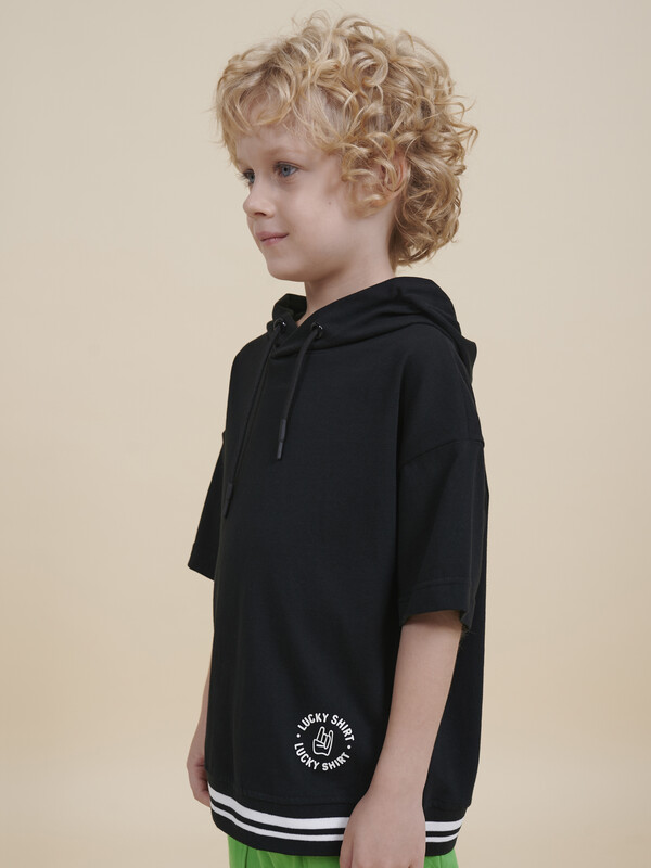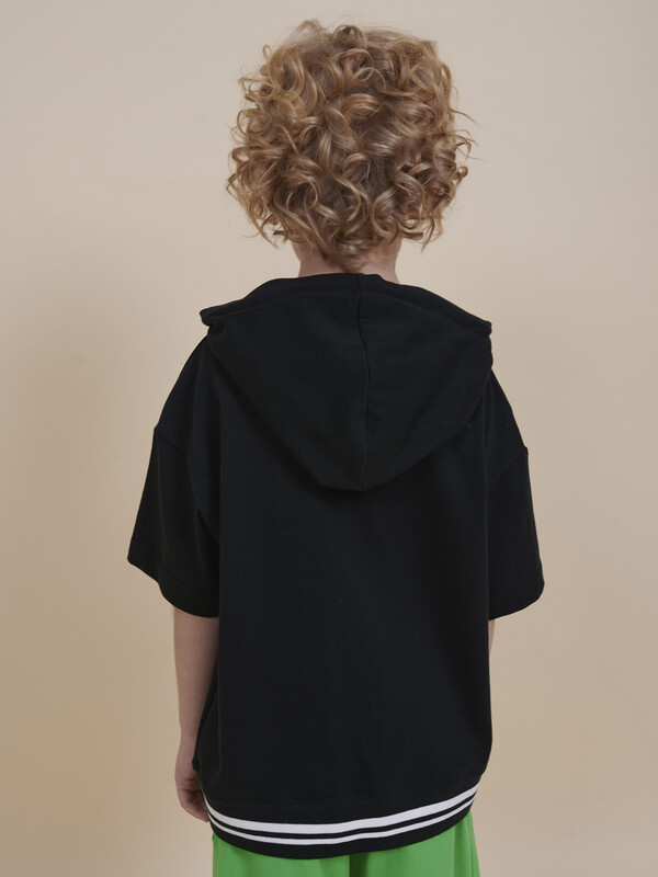 Изделие сшито из 100% натурального хлопка. Футболка детская для мальчика из мягкого материала приятно прилегает к телу, не вызывая дискомфортных ощущений во время движений. Хлопок хорошо пропускает воздух, обеспечивает гигроскопичность. Материал не задерживает влагу - ребенок не потеет. По низу изделие оформлено манжетой из декоративного риба. Одношовный капюшон с утяжкой на круглый, плотный шнур. Футболка для мальчика прослужит долго и будет радовать износостойкостью.