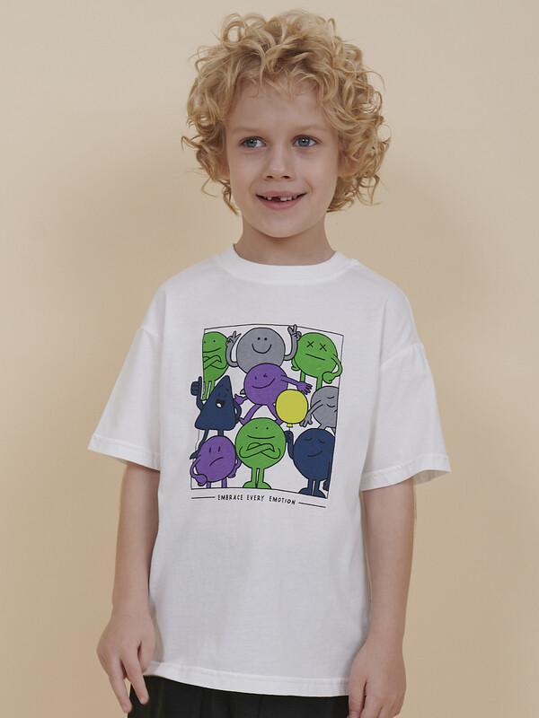 Модель представлена в базовом цвете. Белая футболка для мальчика - красивый вариант на любой выход, украшена надписью "Embrace every emotion" – перевод "Прими каждую эмоцию". Прикольная, детская футболка для мальчика подростка с принтом привлекает интересным дизайном. Футболка для мальчика подростковая рассчитана на возраст садика и школы. Размерная линейка: 1 (86); 2 (92); 3 (98); 4 (104); 5 (110); 6 (116); 7 (122); 8 (128); 9 (134); 10 (140); 11 (146).