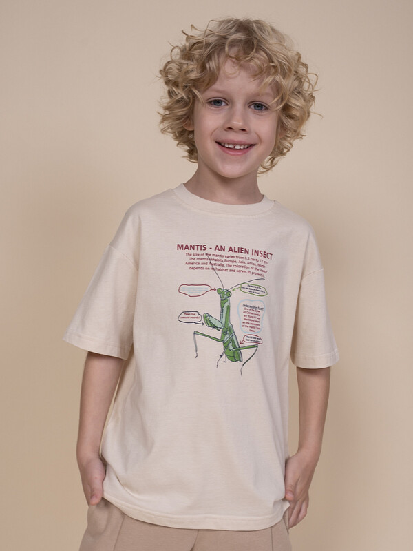 Состав: 100%хлопок Футболка детская – модель умеренного объема на каждый день, для дома и прогулок. Легкая трикотажная футболка подходит в качестве нательного белья и многослойных образов. Базовая футболка на любой сезон. Изделие сшито из 100% натурального хлопка, мягкий материал приятно прилегает к телу, не вызывая дискомфортных ощущений во время движений. Хлопок хорошо пропускает воздух, обеспечивает гигроскопичность, не задерживает влагу - ребенок не потеет. Детская футболка с небольшим вырезом горловины близко к шее. Горловина с широкой обтачкой из риба. Изделие прослужит долго и будет радовать износостойкостью. Модель представлена в бежевом цвете. Универсальный вариант на любой выход. Футболка для мальчика с принтом украшена изображением богомола и образовательным текстом: "Mantis – an alien insekt. The size of the mantis varies from 0.5 cm to 17 cm. The mantis inhabits Eourup, Asia, Africa, North America and Australia. The coloration of the insect depends on it’s habitat and serves to protect it. The mantis is the only one type of insect that can turn it’s head! Interesting fact! One of the styles of chinese martial art “Kung Fu” was developed based on the movements of the mantis from limbs. Mantis have wings, but not all of them. The praying mantis has five eyes: two large and three small. Paws like samurai swords" – перевод "Богомол – инопланетное насекомое. Размер богомола варьируется от 0.5 см до 17 см. Богомол обитает в Евразии, Азии, Африке, Северной Америке и Австралии. Окраска насекомого зависит от его места обитания и служит для его защиты. Богомол – единственный вид насекомых, который может поворачивать голову. Интересный факт! Один из стилей китайского боевого искусства “Кунг Фу” был разработан на основе движений его передних лапок. У богомолов есть крылья, но не у всех. У богомола пять глаз: два больших и три дымчатых. Лапы как самурайские мечи". Прикольная, детская футболка для мальчика подростка с принтом привлекает интересным дизайном. Футболка для мальчика подростковая рассчитана на возраст садика и школы. Размерная линейка: 1 (86); 2 (92); 3 (98); 4 (104); 5 (110); 6 (116); 7 (122); 8 (128); 9 (134); 10 (140); 11 (146). Крутая футболка для мальчика – отличный подарок для сына, внука, братика, племянника, крестника! Выбирайте нужный размер по таблице размеров на фото. Цвет товара на экране вашего устройства может отличаться от цвета изделия вживую. Комментарии к товару
