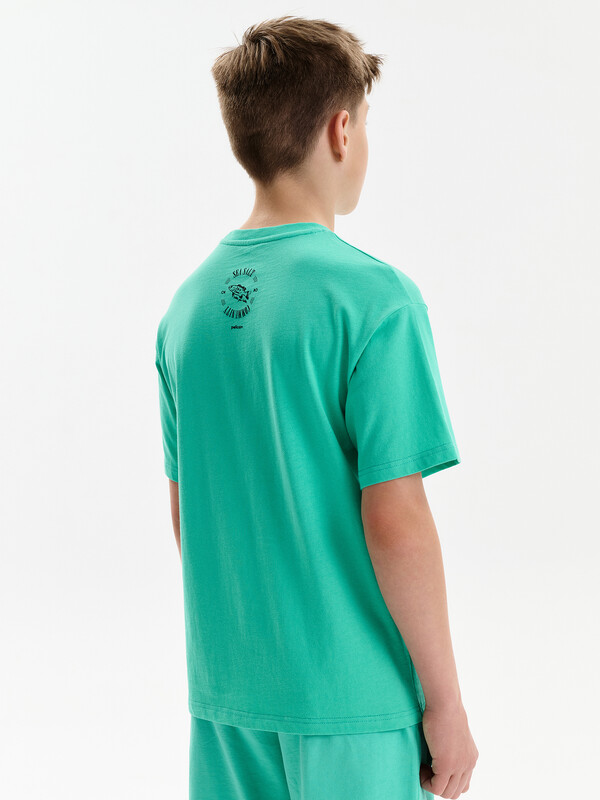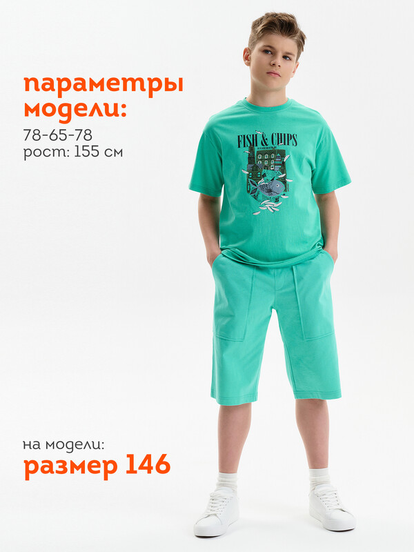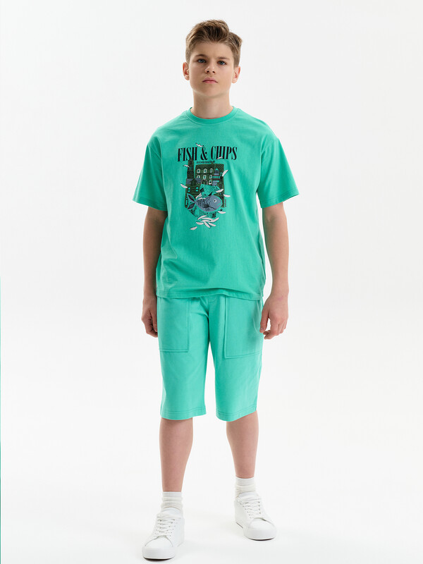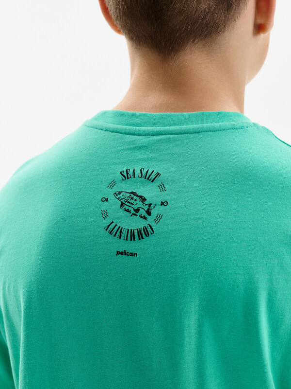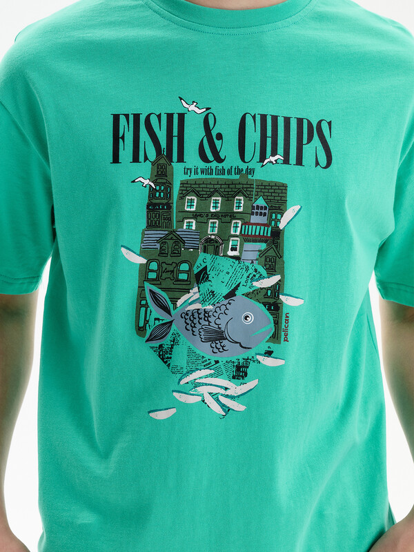 Футболка для мальчика прямого кроя умеренного объема.  Вырез горловины обработан эластичной рибаной — она прекрасно держит форму, не растягивается, при этом ребёнку удобно надевать и снимать футболку. Футболка с принтом и надписями. Перевод текста: Рыба с картофелем фри; Попробуйте с рыбой дня; Морская соль; Сообщество; Жизнь прекрасна; Увидимся позже.