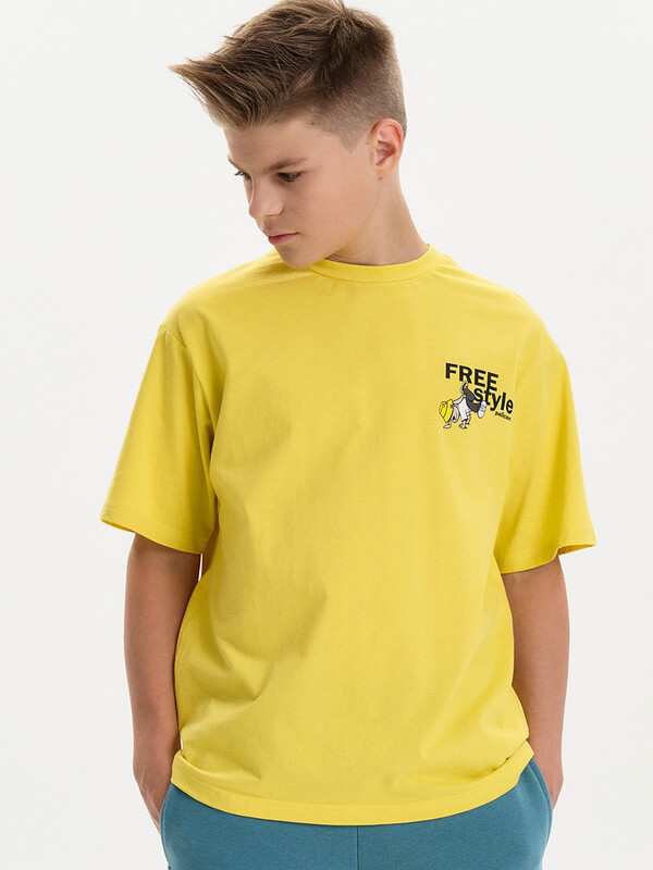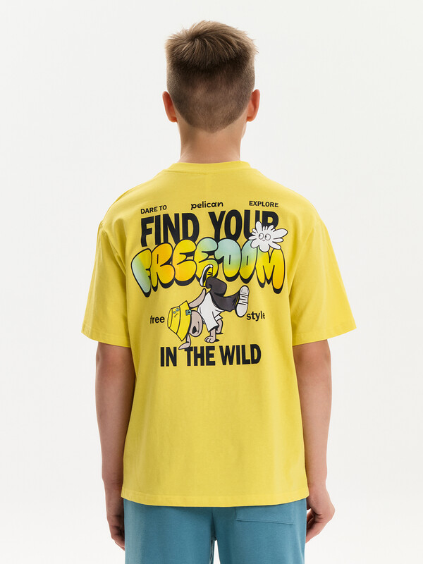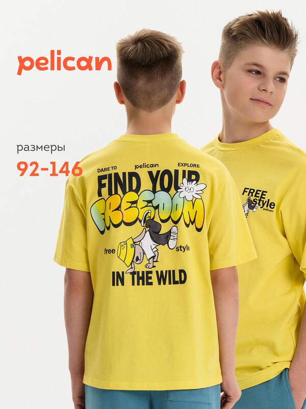 Футболка для мальчика. Комфортная, умеренного оверсайз-объёма со спущенным плечом. Вырез горловины обработан эластичной рибаной (ткань в рубчик) — она отлично держит форму, не растягивается, при этом ребёнку удобно надевать и снимать футболку. Перевод спереди: свободный стиль, перевод на спике: осмельтесь исследовать; Найди свою свободу; Свободный стиль; В дикой природе.