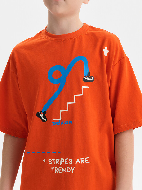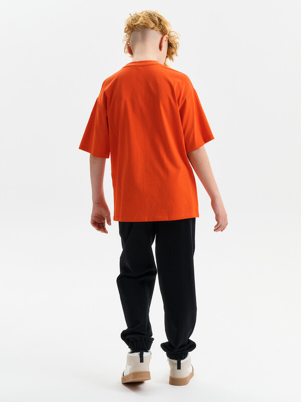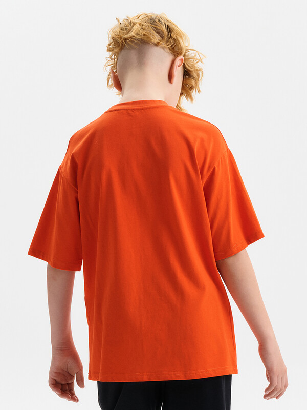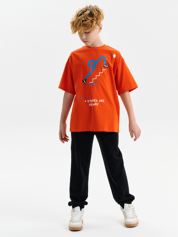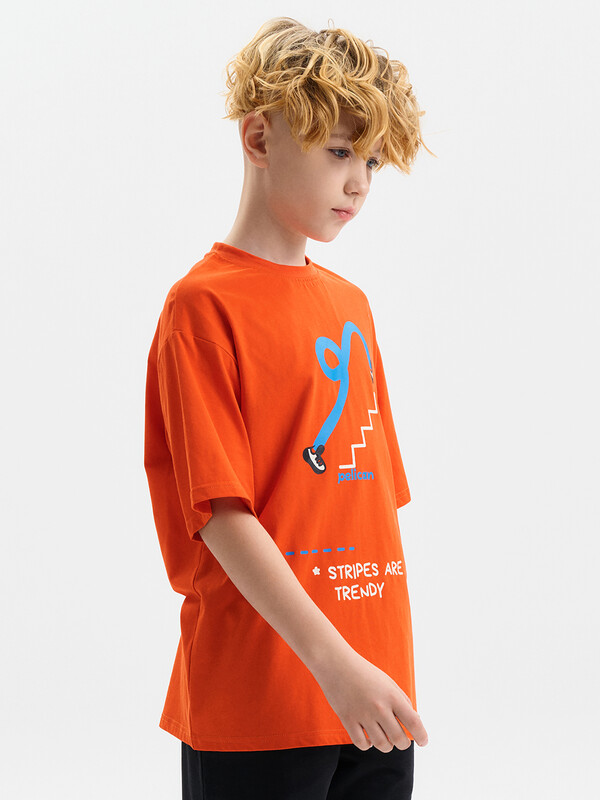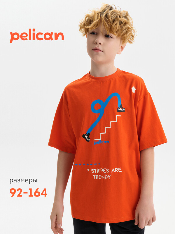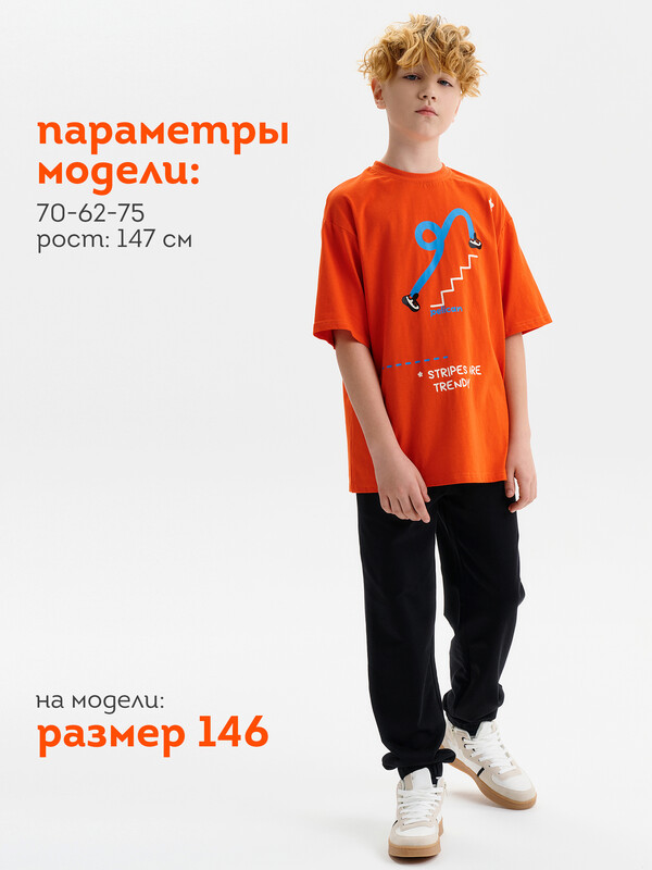 Футболка для мальчика. Комфортная, умеренного оверсайз-объёма со спущенным плечом. Вырез горловины обработан эластичной рибаной (ткань в рубчик) — она отлично держит форму, не растягивается, при этом ребёнку удобно надевать и снимать футболку. Перевод: красный цвет в тренде.