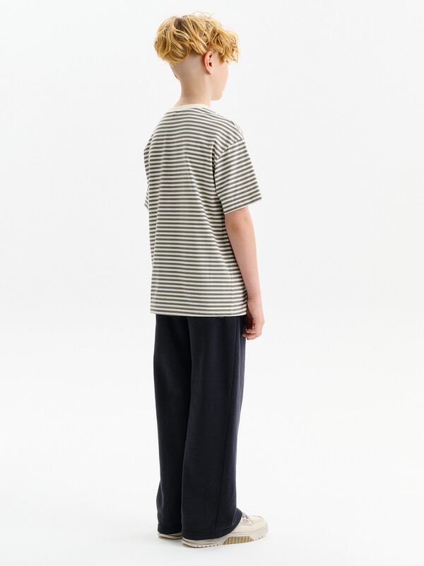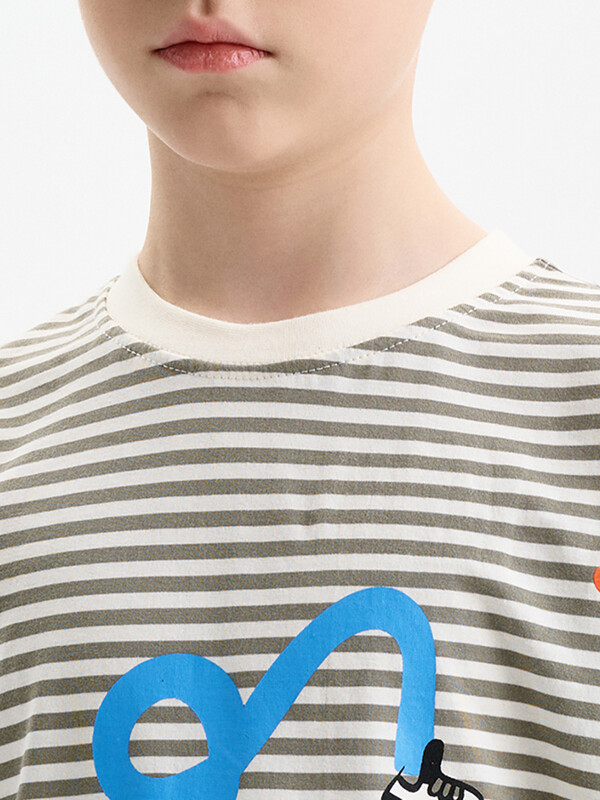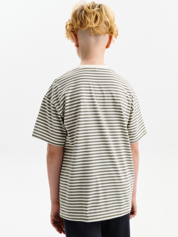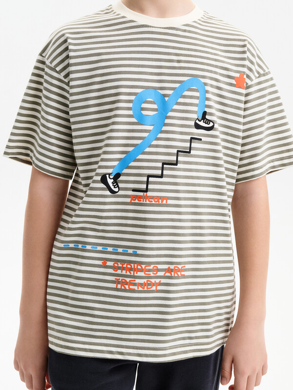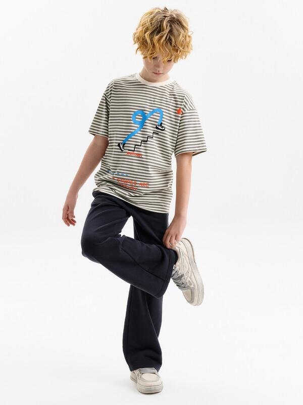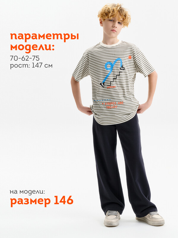 Футболка для мальчика прямого кроя умеренного объема. Уменьшена длина по сравнению с футболками Осень 25. Вырез горловины обработан эластичной рибаной — она прекрасно держит форму, не растягивается, при этом ребёнку удобно надевать и снимать футболку. Футболка с принтом и надписями. Перевод: полоски в тренде.