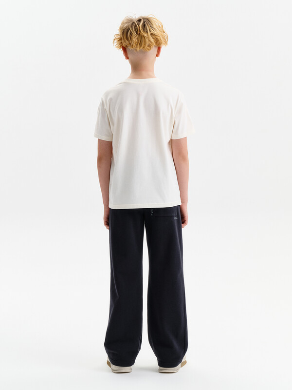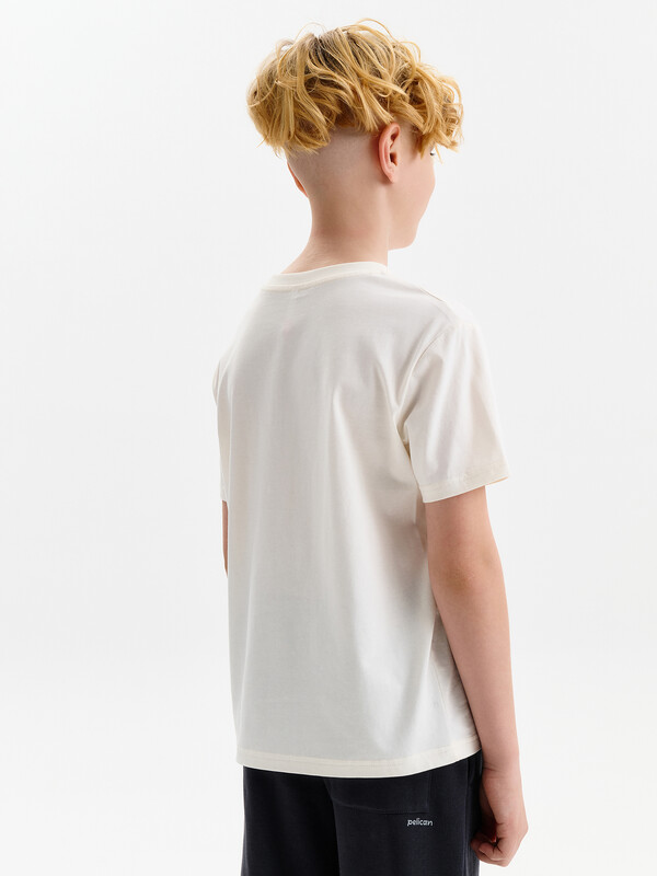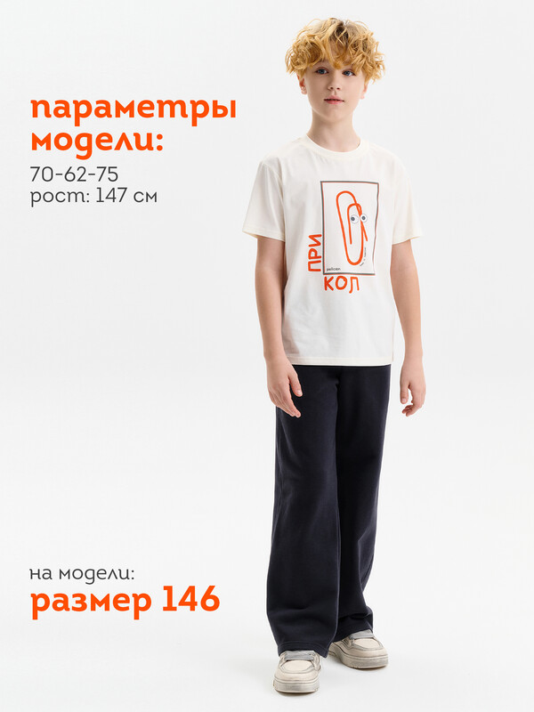 Футболка для мальчика прямого кроя умеренного объема. Уменьшена длина по сравнению с футболками Осень 25. Вырез горловины обработан эластичной рибаной — она прекрасно держит форму, не растягивается, при этом ребёнку удобно надевать и снимать футболку. Футболка с принтом и надписями.
