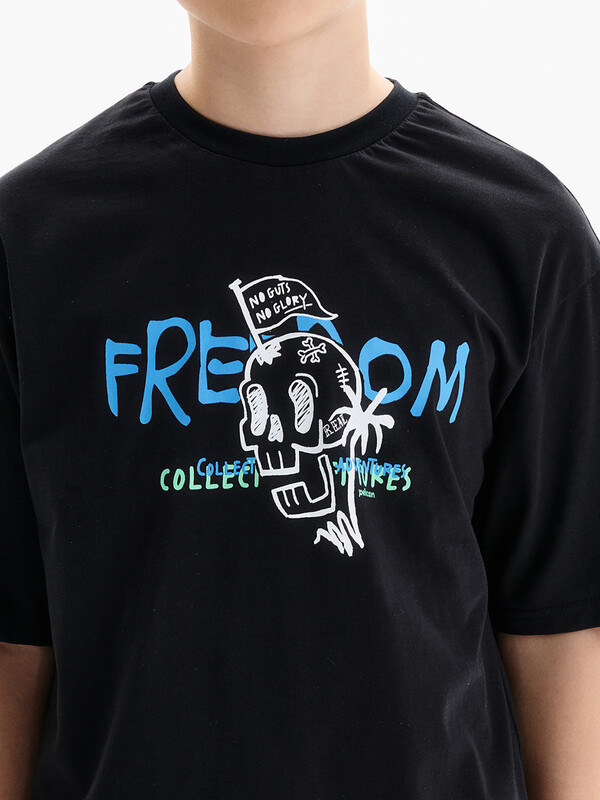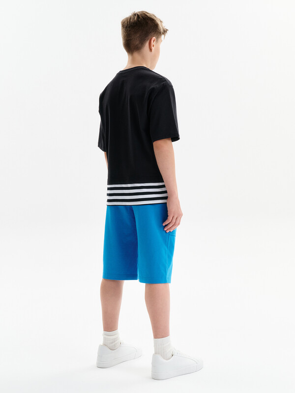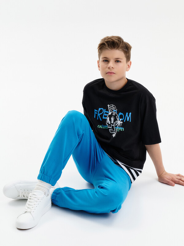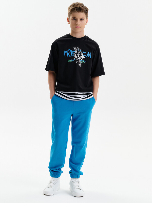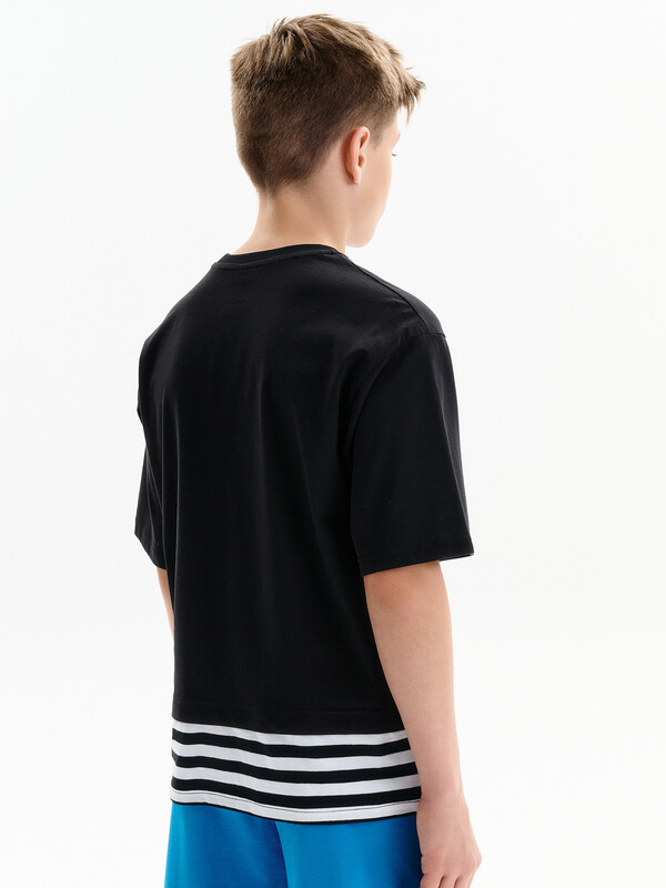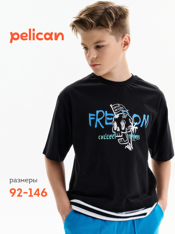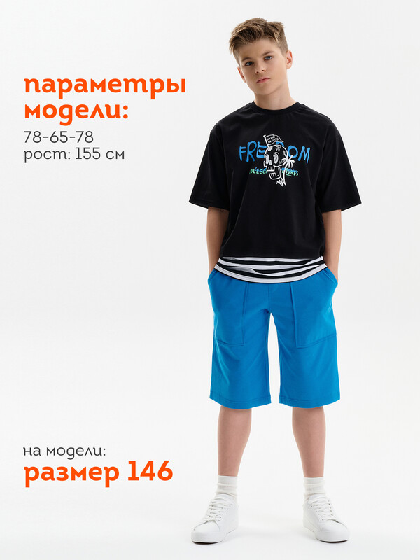 Футболка для мальчика. Комфортная, умеренного оверсайз-объёма со спущенным плечом. Вырез горловины обработан эластичной рибаной (ткань в рубчик) — она отлично держит форму, не растягивается, при этом ребёнку удобно надевать и снимать футболку. Футболка с иммитацией многослойности за счет вставок по низу переда и спинки из материала в полоску. Перевод: Нет смелости — нет славы; Свобода; Коллекционируй приключения; Настоящий.