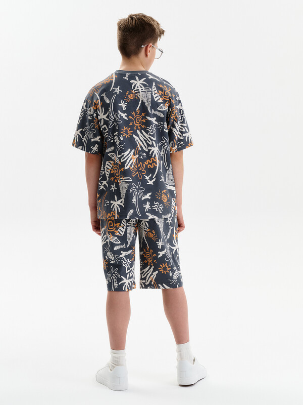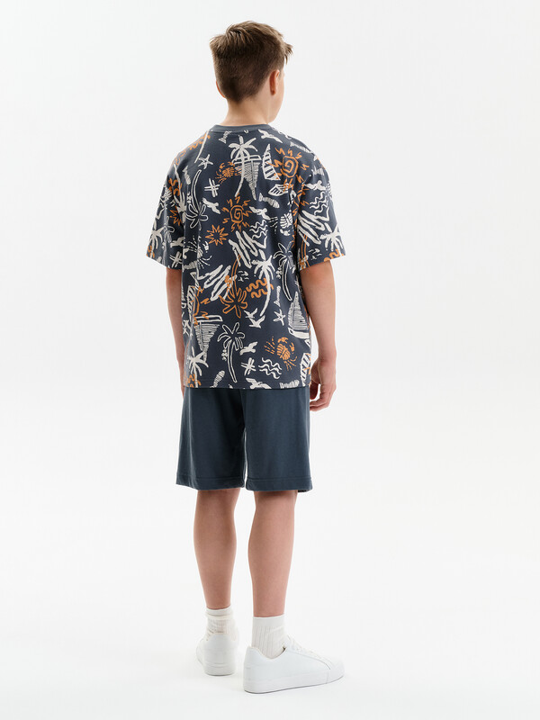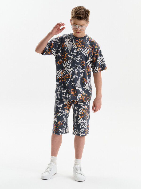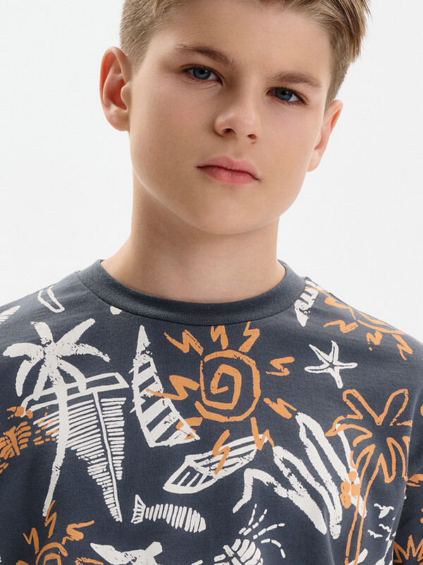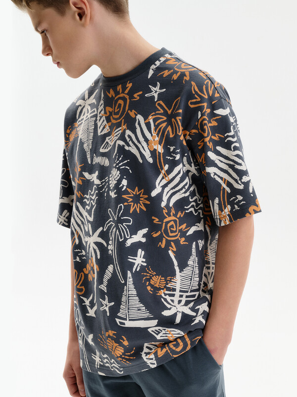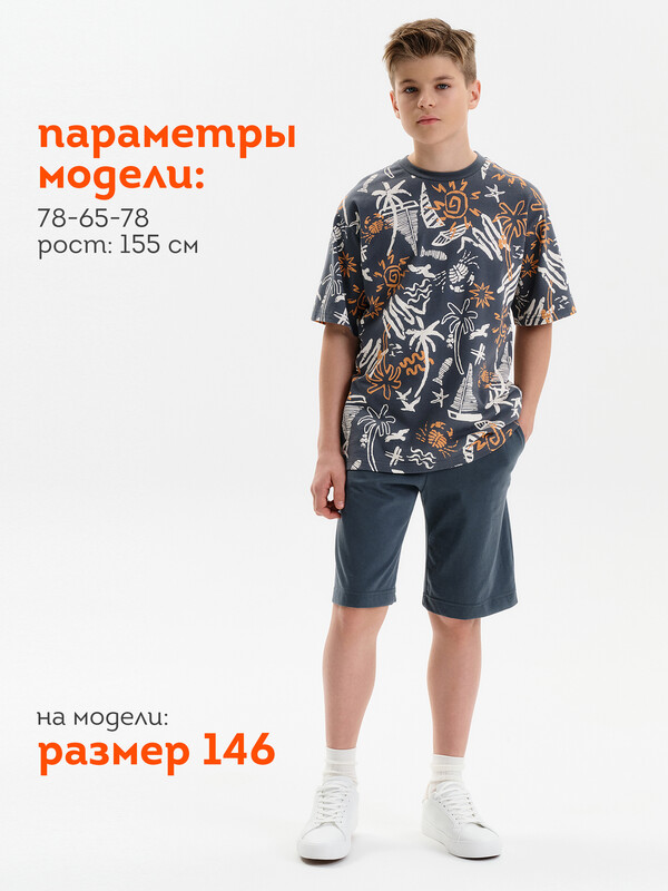 Футболка для мальчика. Комфортная, умеренного оверсайз-объёма со спущенным плечом. Вырез горловины обработан эластичной рибаной (ткань в рубчик) — она отлично держит форму, не растягивается, при этом ребёнку удобно надевать и снимать футболку.