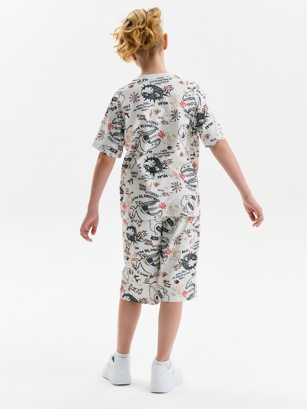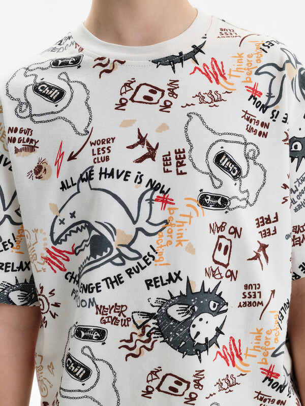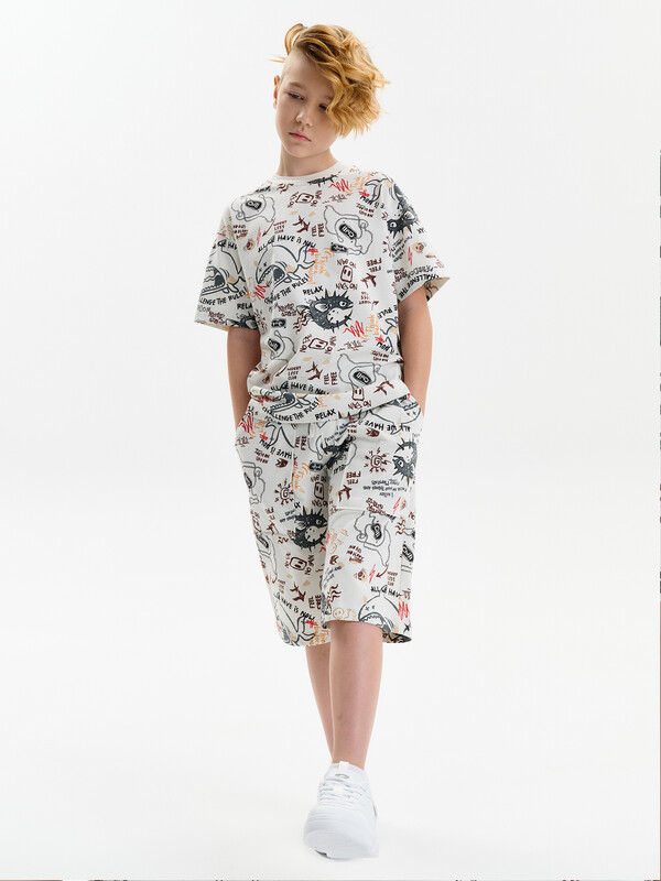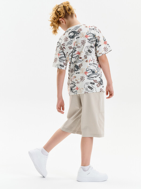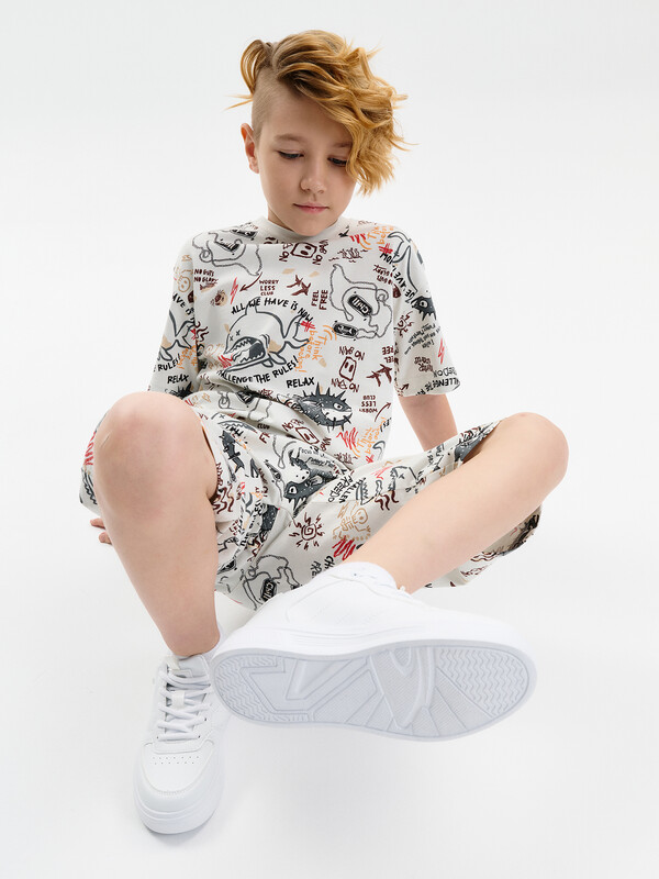 Футболка для мальчика прямого кроя умеренного объема.  Вырез горловины обработан эластичной рибаной — она прекрасно держит форму, не растягивается, при этом ребёнку удобно надевать и снимать футболку. Футболка с принтом и надписями. Перевод: Нет смелости — нет славы; Нет боли — нет выгоды; Не стесняйся;