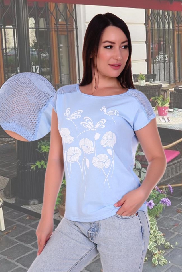 Футболка женская с принтом из комбинированного трикотажа - кулирки и ажурного трикотажа. Футболка слегка приталенная, горловина в виде лодочки, спущенная пройма, на плечах кокетка - погоны из ажурного трикотажа. Низ спинки удлинён и слегка закруглён. Футболка из натурального 100% хлопка - комфортная, приятная к телу, подойдёт как для повседневного гардероба, так и для активного отдыха.