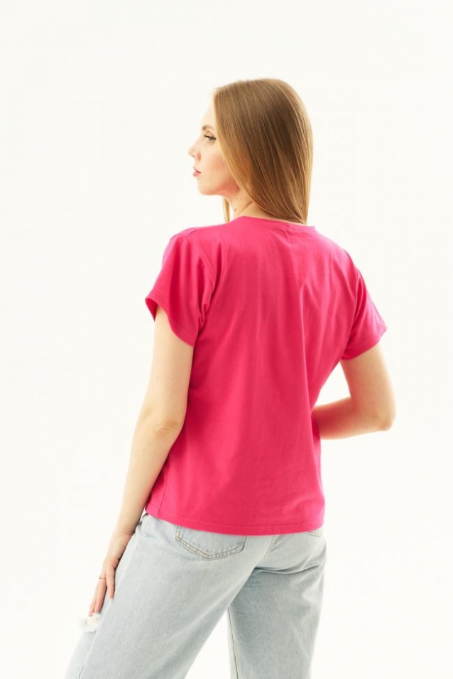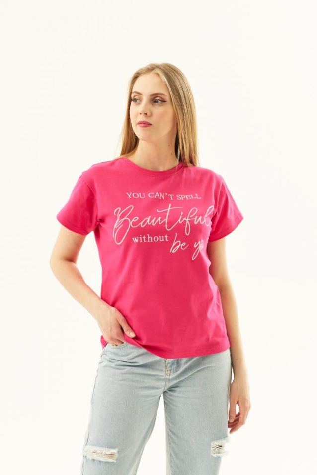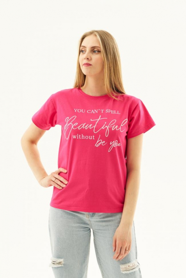 Футболка женская, прямого силуэта, длиной до середины бедра. Вырез горловины - округлый. Рукав втачной, короткий. Полочку футболки украшает буквенный принт.