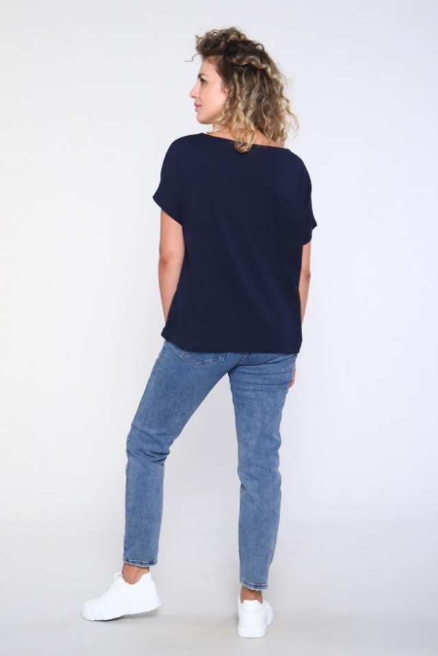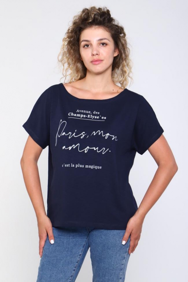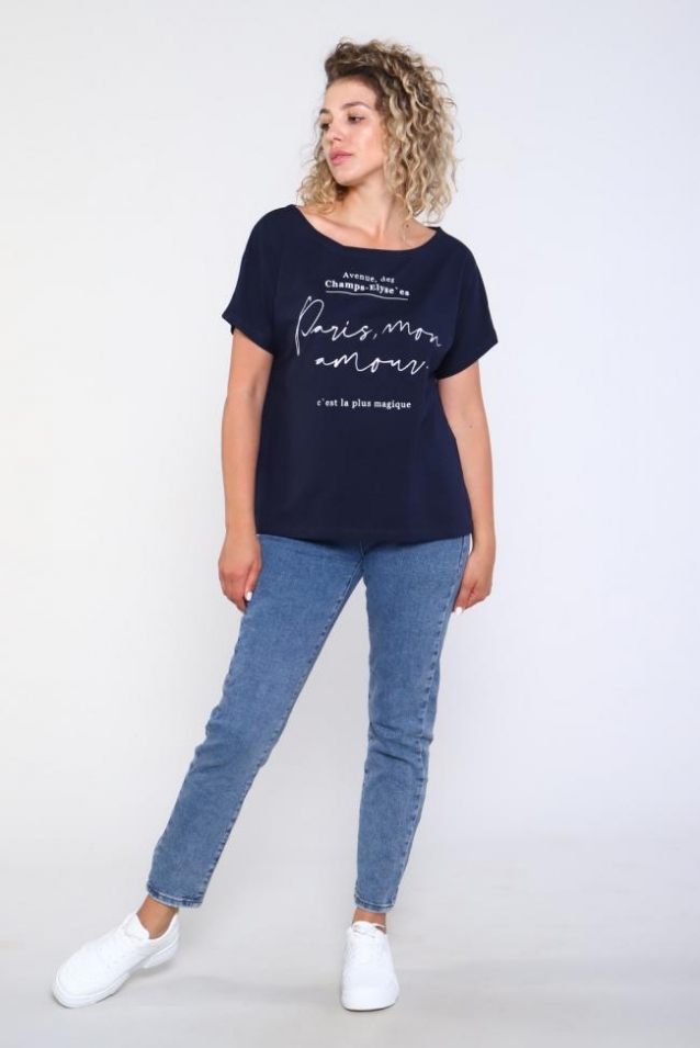 Универсальная футболка для стильных дам. Свободный крой, спущенный рукав, имеет декоративную, глянцевую печать в стиле шелкографии с добавлением глиттера.