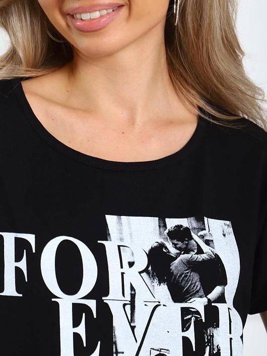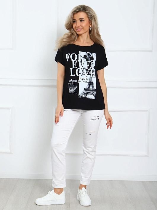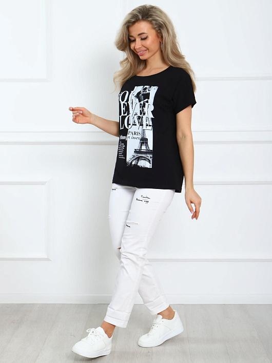 Футболка женская из натурального трикотажа. Свободный крой позволяет носить его на разные типы фигур. Мягкие линии делают эту модель очень женственной. Горловина круглой формы. Спущенная линия плеч. Низ изделия прямой. По центру нанесен принт, шелкография.
