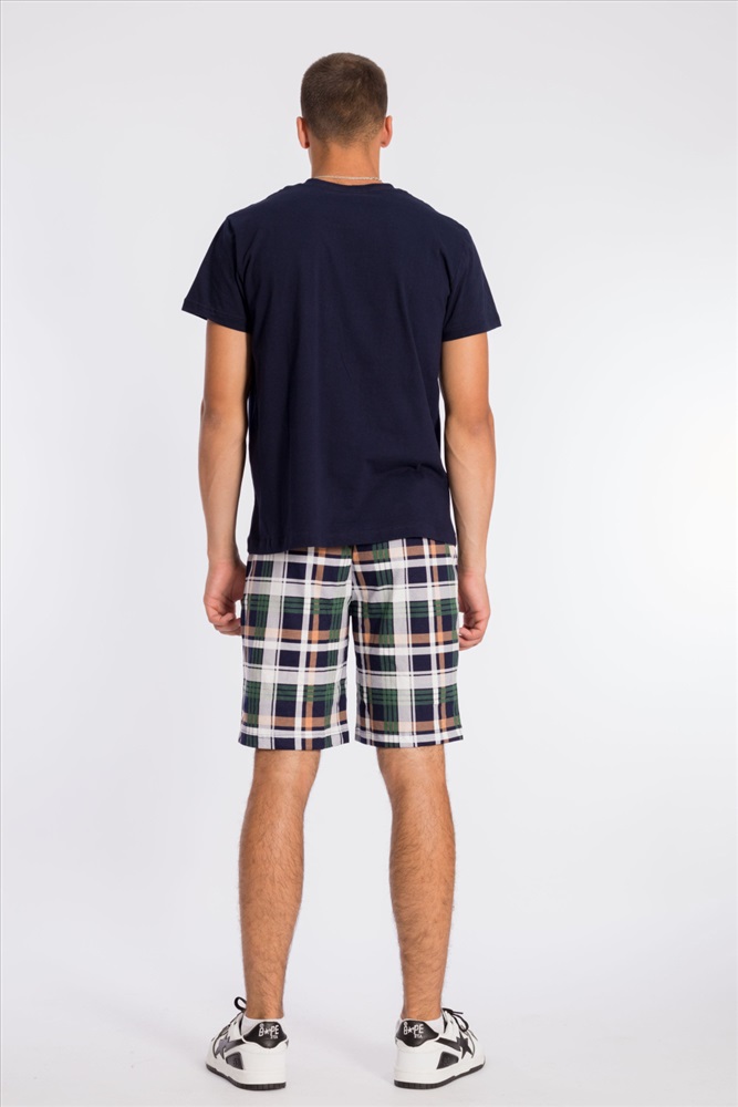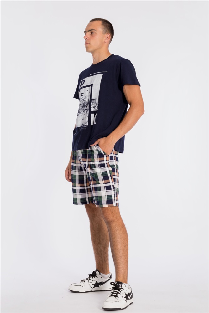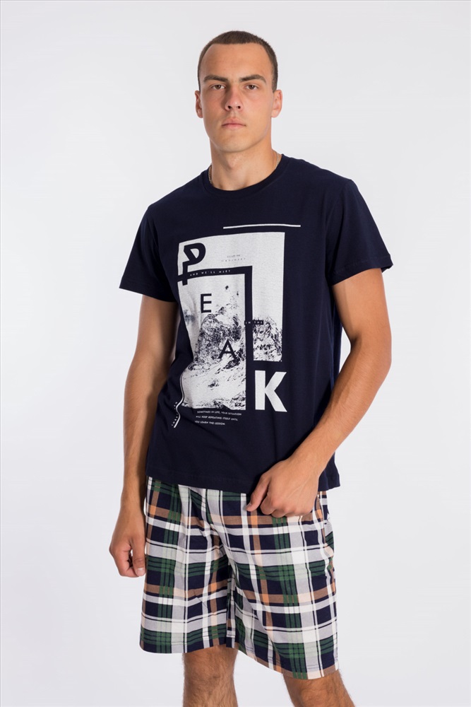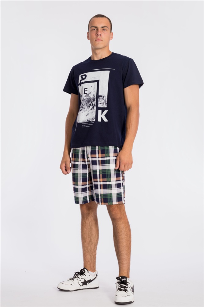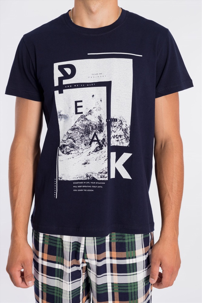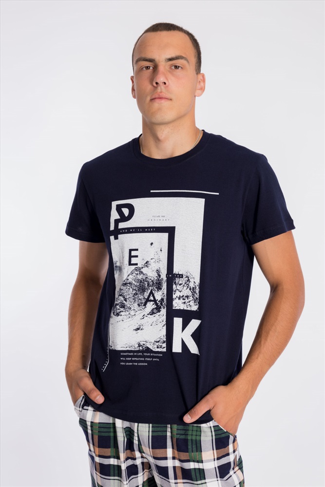 Футболка мужская, выполнена из однотонной хлопковой ткани. Свободного кроя, короткий рукав. Горловина с круглым вырезом, отделанным планкой. Спереди нанесён принт.