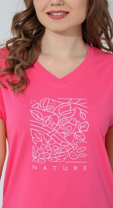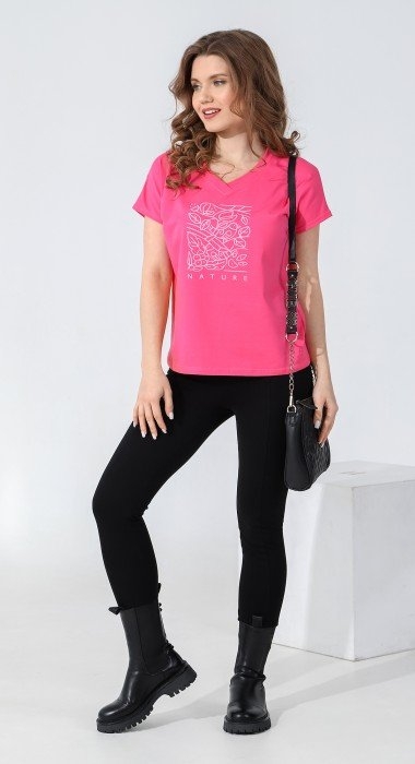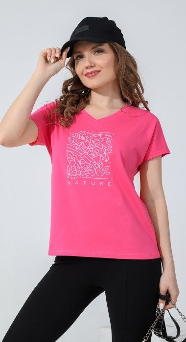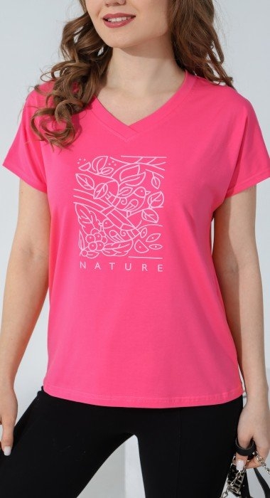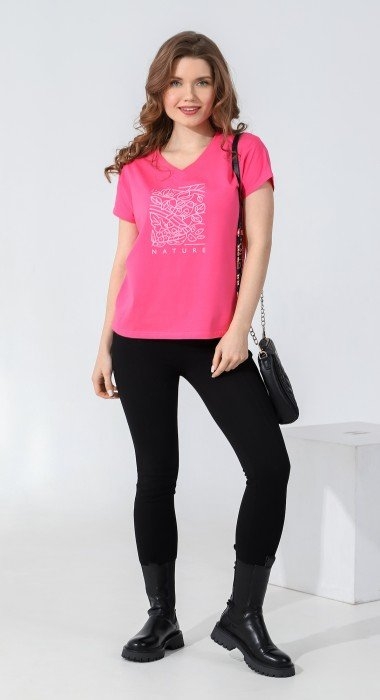 Футболка – с короткими цельнокроеными рукавами, V-образным вырезом горловины, обработанным втачными планками, заходящими друг на друга спереди, и принтом на полочке.
