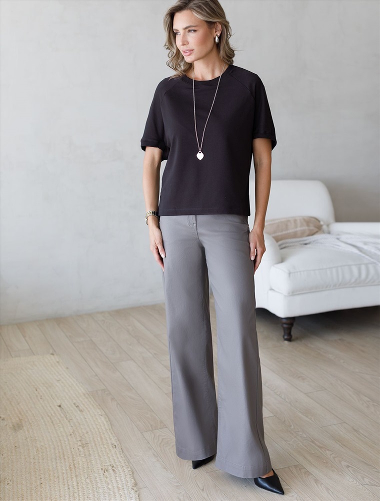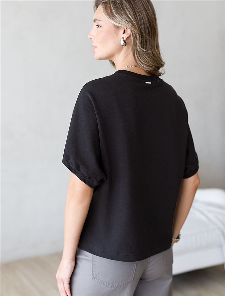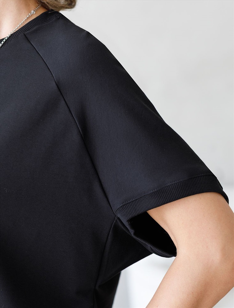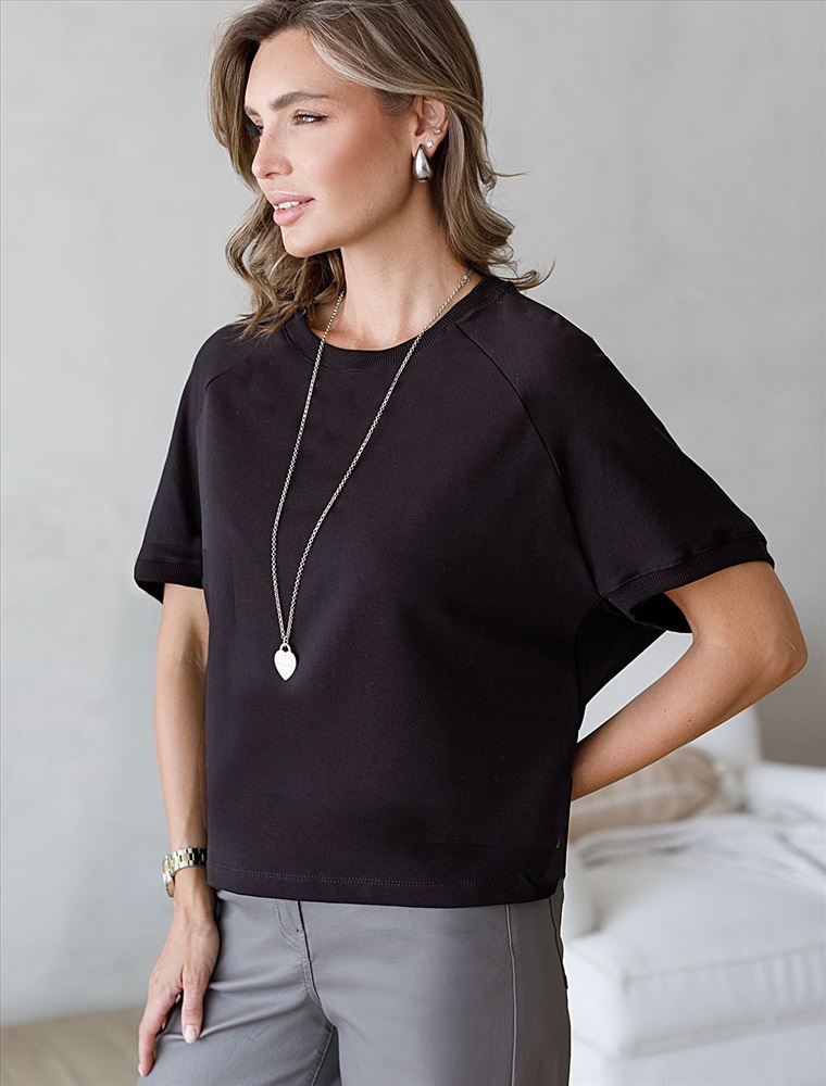 Футболка с рукавами регланами выполнена из эластичного футера двухнитки. Свободная модель со спущенной линией плеча легко поможет составить образы в расслабленном стиле. Сочетается в костюме с брюками D44.135, D44.136 и юбкой D46.034. Наличие эластана в составе изделия гарантирует абсолютный комфорт и формоустойчивость.