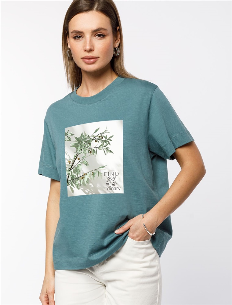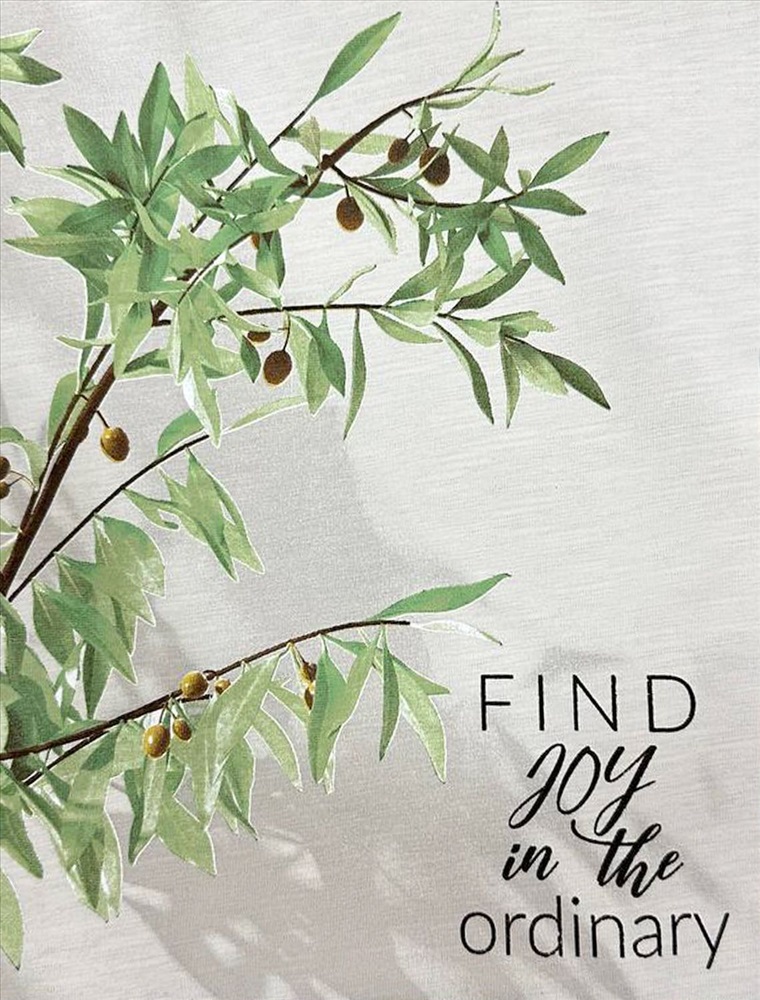 Перевод принта: Find joy in the ordinary - находи радость в мелочах. Футболка выполнена из фактурного полотна из 100% хлопка. Модель с лаконичным авторским принтом легко впишется в любой весенне-летний гардероб. Ткань имеет характерный рисунок черточки за счет сочетания разных волокон хлопка 140-150 г. Хорошо держит форму и поддерживает комфортный микроклимат в течении дня.