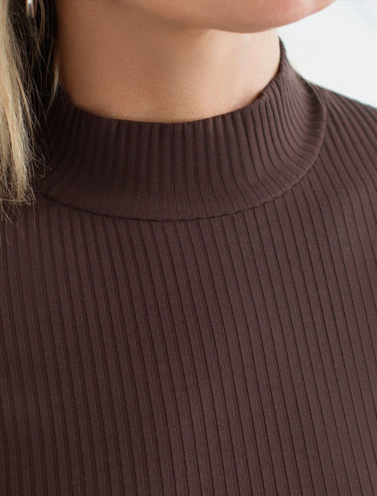 Футболка с воротом стойка выполнена из фактурного трикотажа в рубчик. Модель идеально сидит по фигуре не сковывая движения. Хлопковый трикотаж поддерживает оптимальную температуру тела, поэтому в изделии будет комфортно в течении всего дня. Наличие эластана в составе гарантирует формоустойчивости. Базовая модель впишется в любой гардероб и подойдет для офисного дресс-кода.