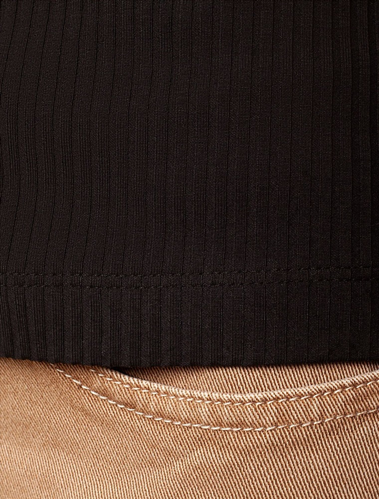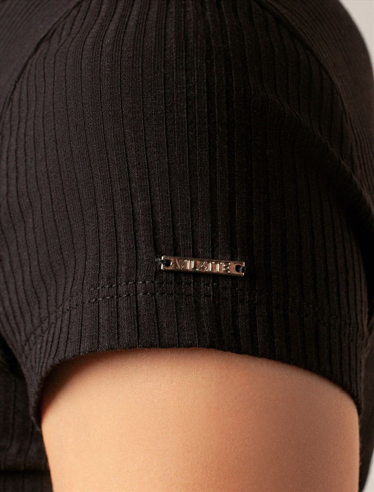 Футболка с воротом стойка выполнена из фактурного трикотажа в рубчик. Модель идеально сидит по фигуре не сковывая движения. Хлопковый трикотаж поддерживает оптимальную температуру тела, поэтому в изделии будет комфортно в течении всего дня. Наличие эластана в составе гарантирует формоустойчивости. Базовая модель впишется в любой гардероб и подойдет для офисного дресс-кода.