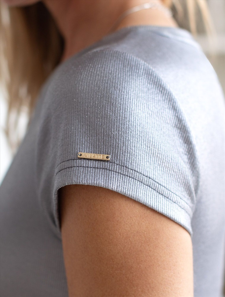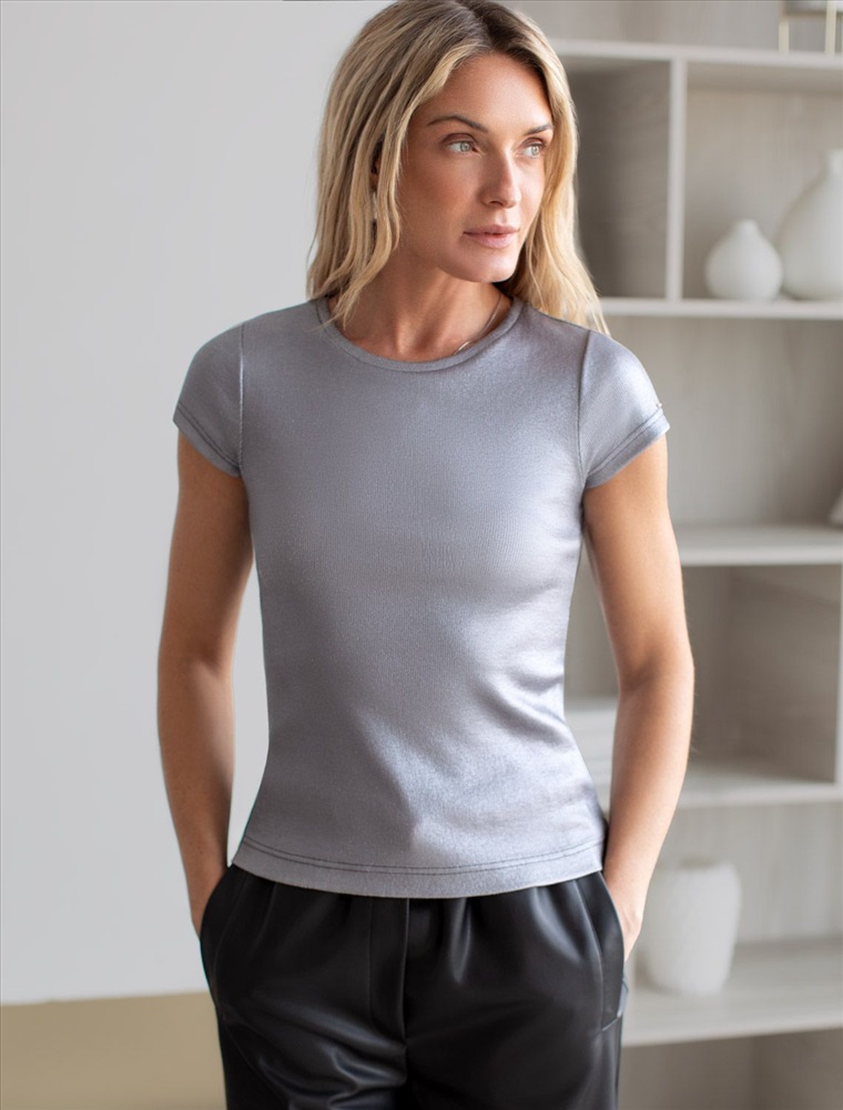 Футболка выполнена из хлопка в рубчик с матовым металлическим покрытием. Добавление эластана в состав изделия способствует формоустойчивости и комфортной посадке по фигуре. Трендовый металлизированный эффект смотрится эффектно в любом образе. С нарядным вечерним низом или джинсами, с деловым костюмом офис. Изделие дополнено металлическим логотипом бренда.