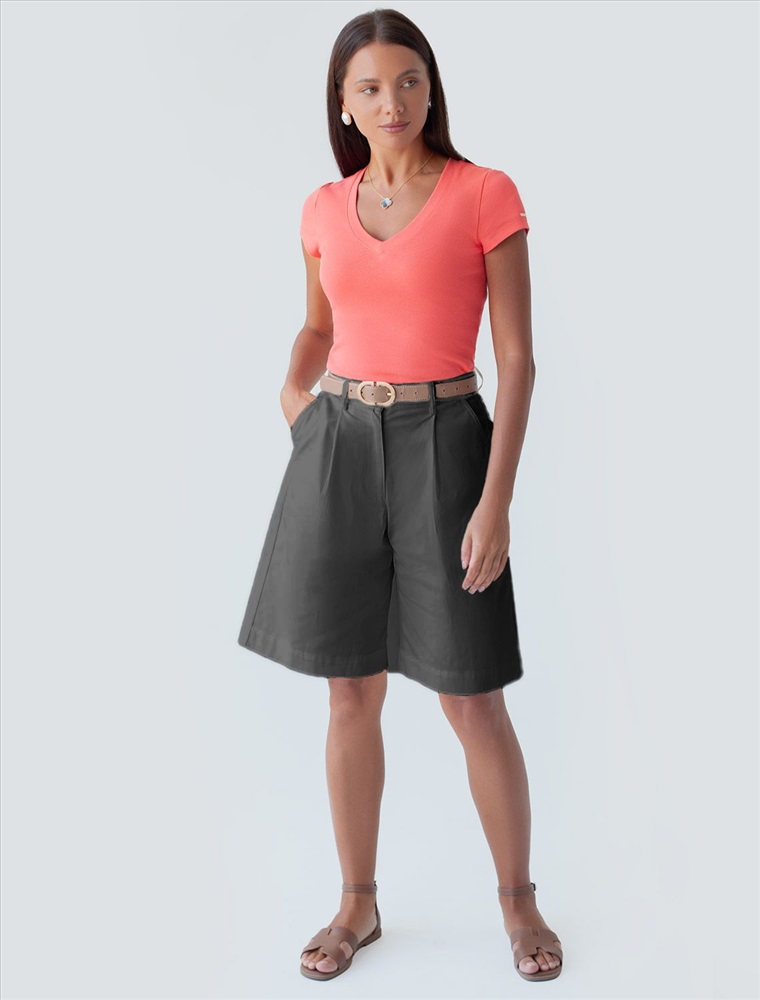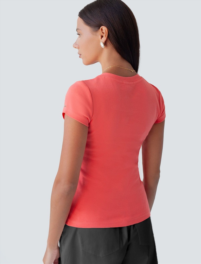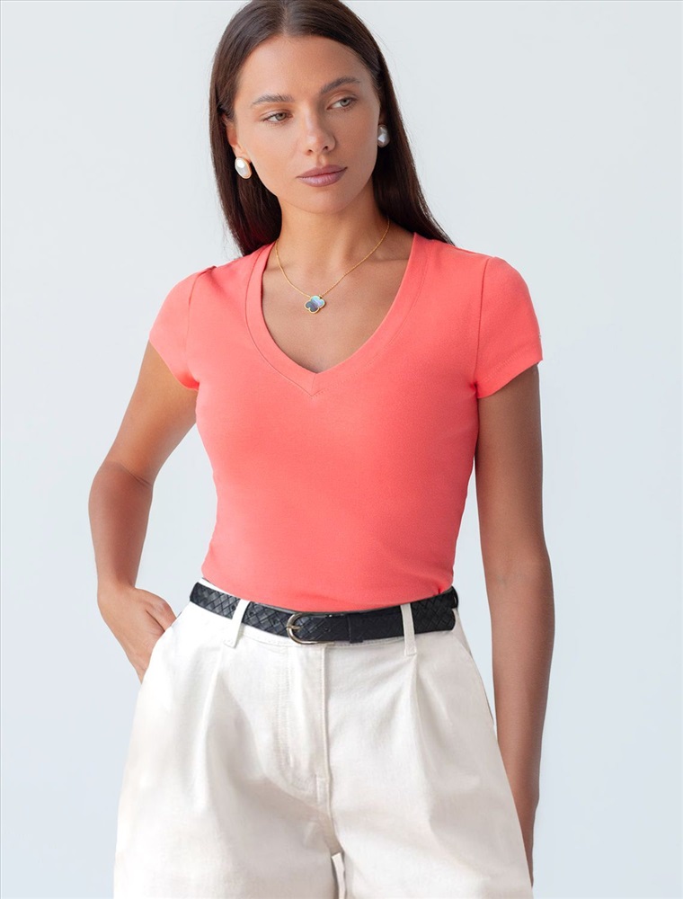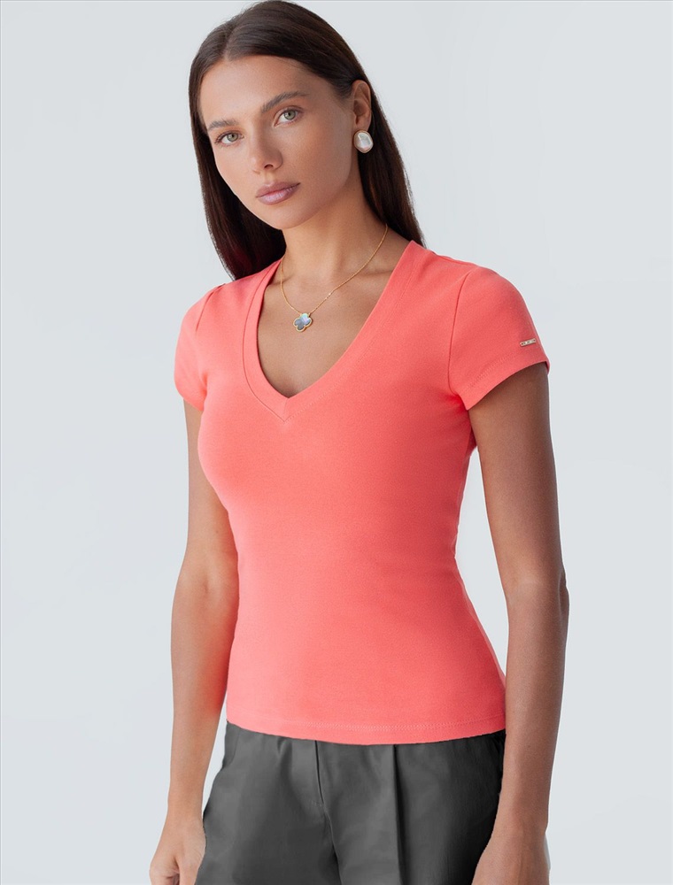 Облегающая футболка с V-образным вырезом в цвете "розовый коралл" создаст утонченный образ. Идеальная базовая модель для вашего гардероба! Глубокий V-образный вырез подчеркивает линию шеи и зрительно удлиняет силуэт. Футболка выполнена из хлопка с добавлением эластана, которая мягко облегает контуры тела, подчеркивая достоинства фигуры. Универсальный вариант для создания стильных повседневных образов.