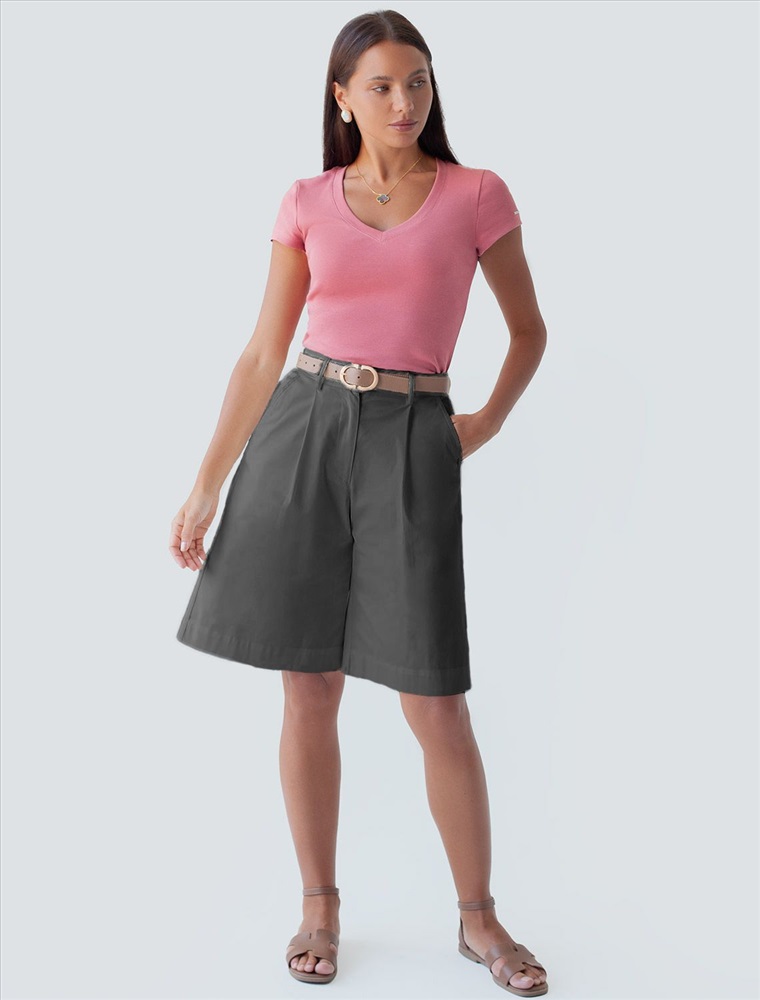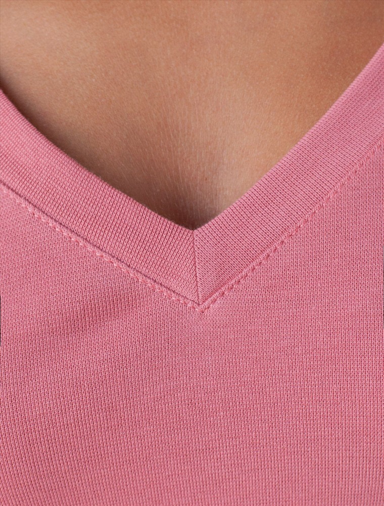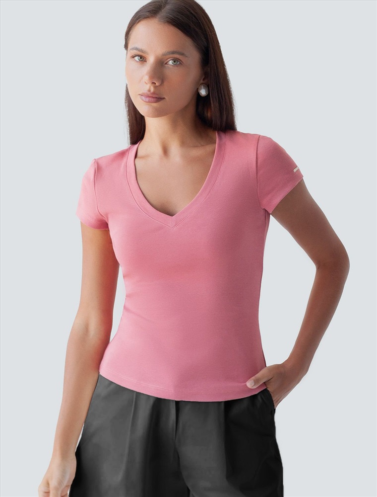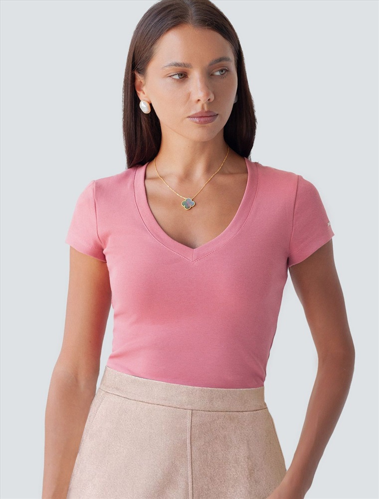 Облегающая футболка с V-образным вырезом оттенка "туманная роза" создаст утонченный образ. Идеальная базовая модель для вашего гардероба! Глубокий V-образный вырез подчеркивает линию шеи и зрительно удлиняет силуэт. Футболка выполнена из хлопка с добавлением эластана, которая мягко облегает контуры тела, подчеркивая достоинства фигуры. Универсальный вариант для создания стильных повседневных образов.