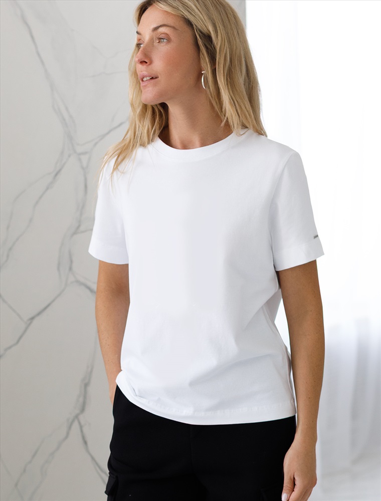 Базовая однотонная футболка из премиального хлопка. Горловина выполнена из рибаны в тон изделия, Добавление эластана в состав изделия способствует формоустойчивости. Самое высокое качество хлопковых волокон обеспечивает комфорт в любое время года. Идеально держит форму и сохраняет внешний вид в течение долговременного использования. Универсальная базовая вещь для ваших стилистических решений. Изделие дополнено металлическим логотипом бренда на рукаве.