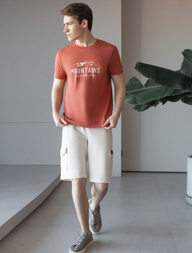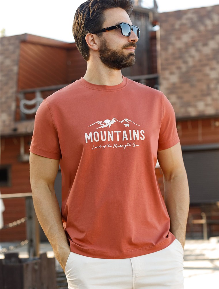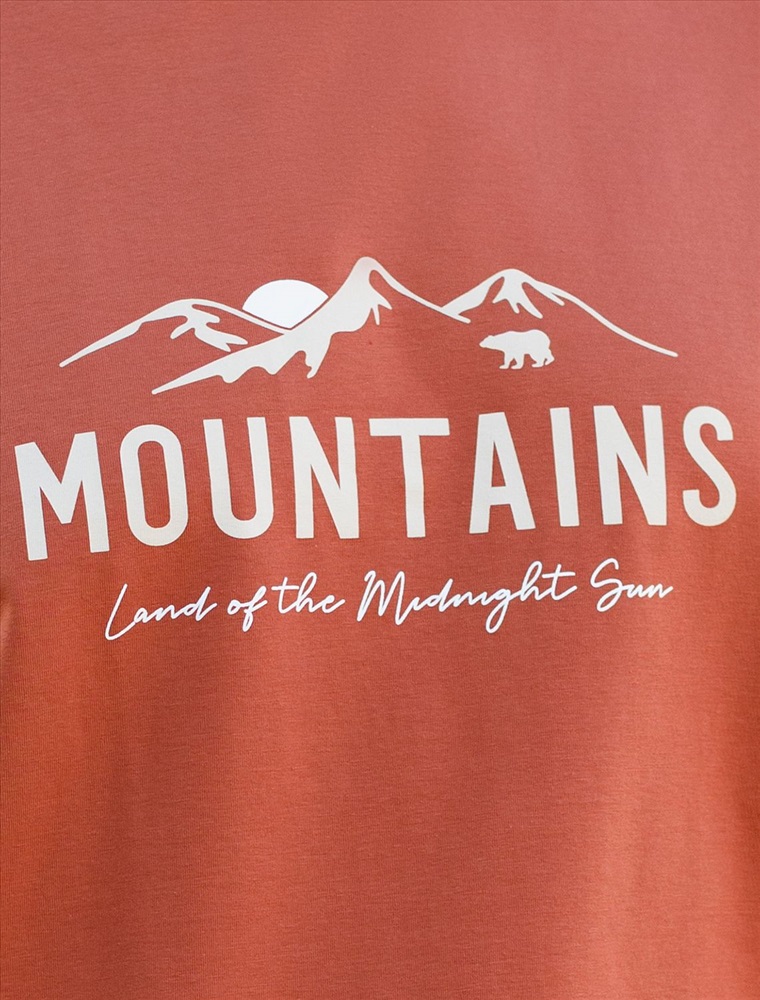 Перевод принта: Mountains, land of the midnight sun - горы - страна полуночного солнца. Футболка выполнена из премиального хлопка с эластаном. Авторский принт нанесен фактурными красками с устойчивым покрытием. Изделие комфортно сидит по фигуре, не сковывая движений. За счет среднего объема, хорошо подойдет как первый слой под пиджак, кардиган или бомбер. На рукаве нашивка из эко-кожи с логотипом бренда.