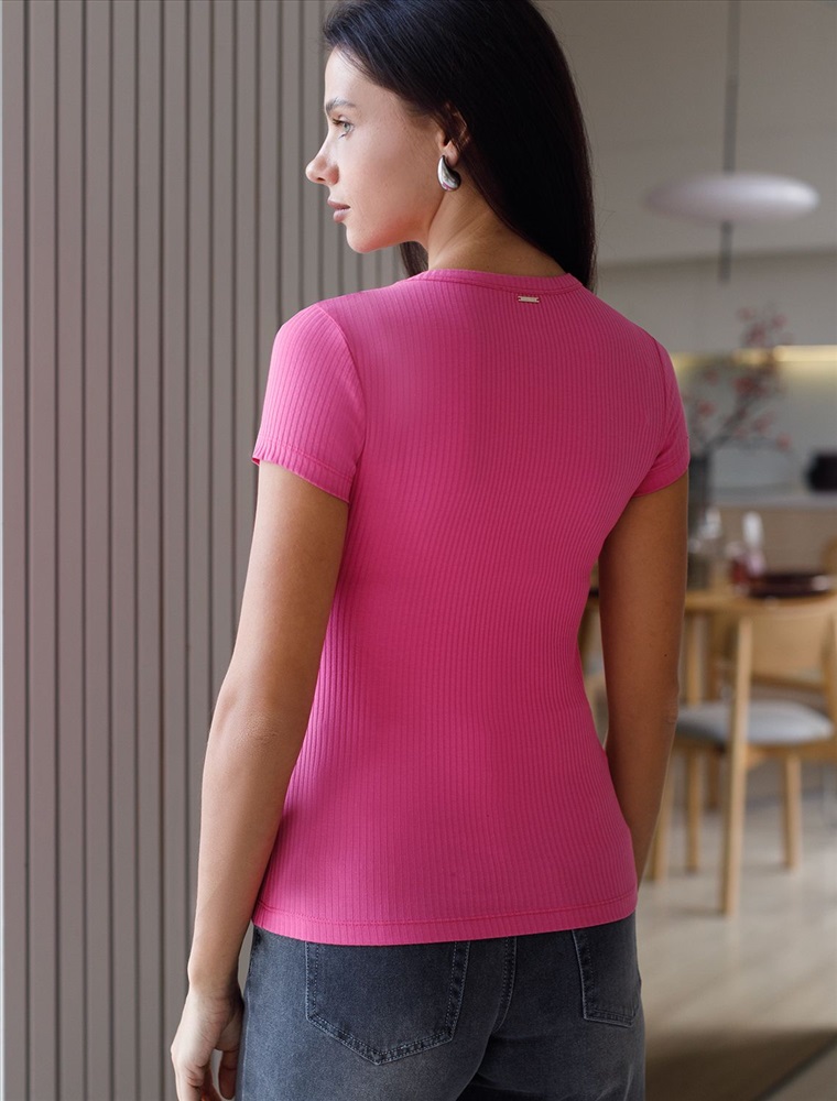 Футболка выполнена из трикотажа в широкий рубчик. Эластичный хлопковый трикотаж сидит по фигуре, не сковывает движений и очень комфортный в носке. Фактура вертикальных полос визуально стройнит и вытягивает силуэт. Базовое изделие хорошо впишется в любой гардероб. Идеально подходит для многослойных образов.