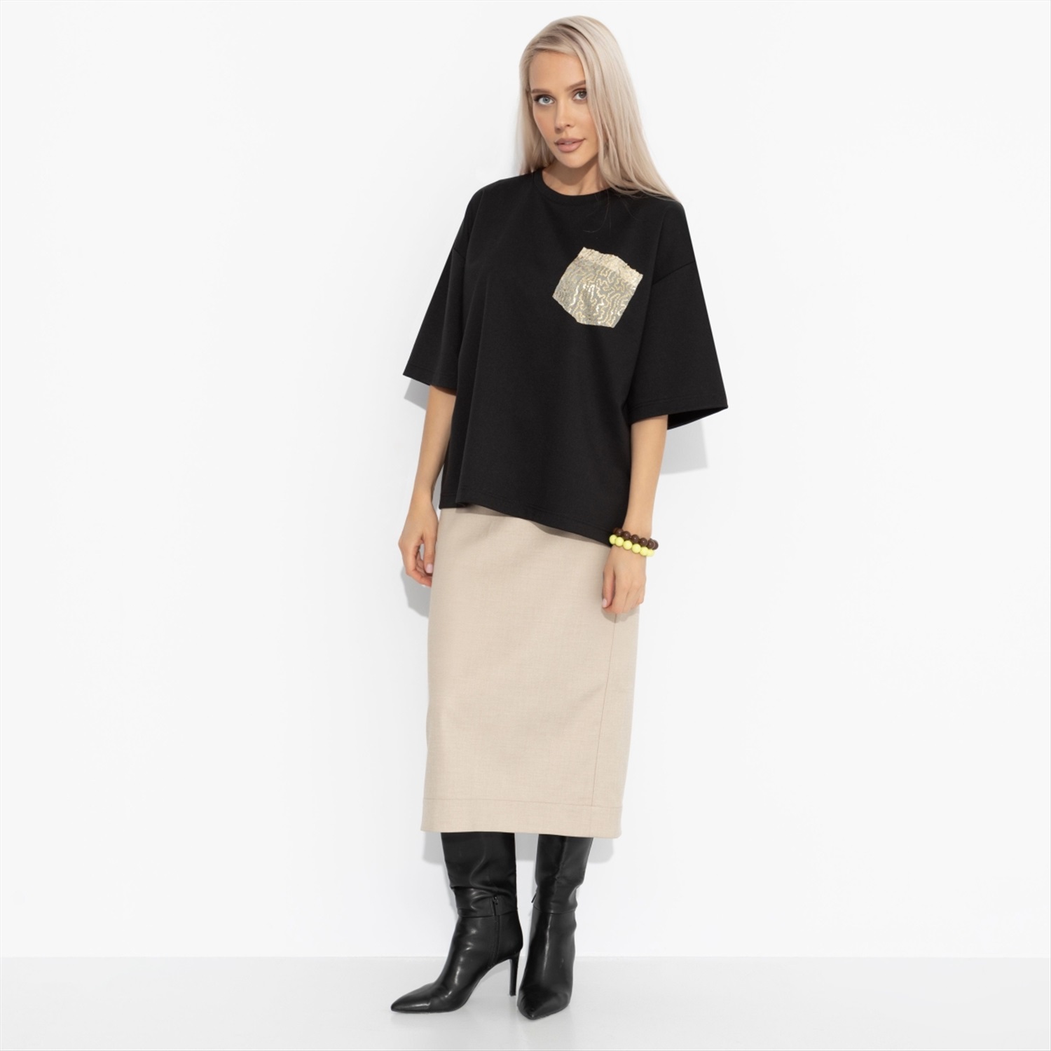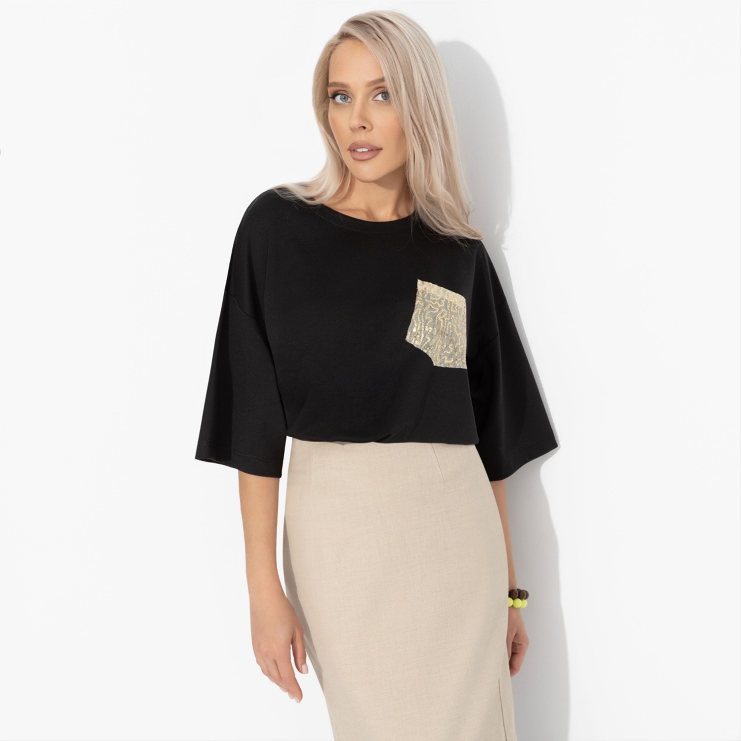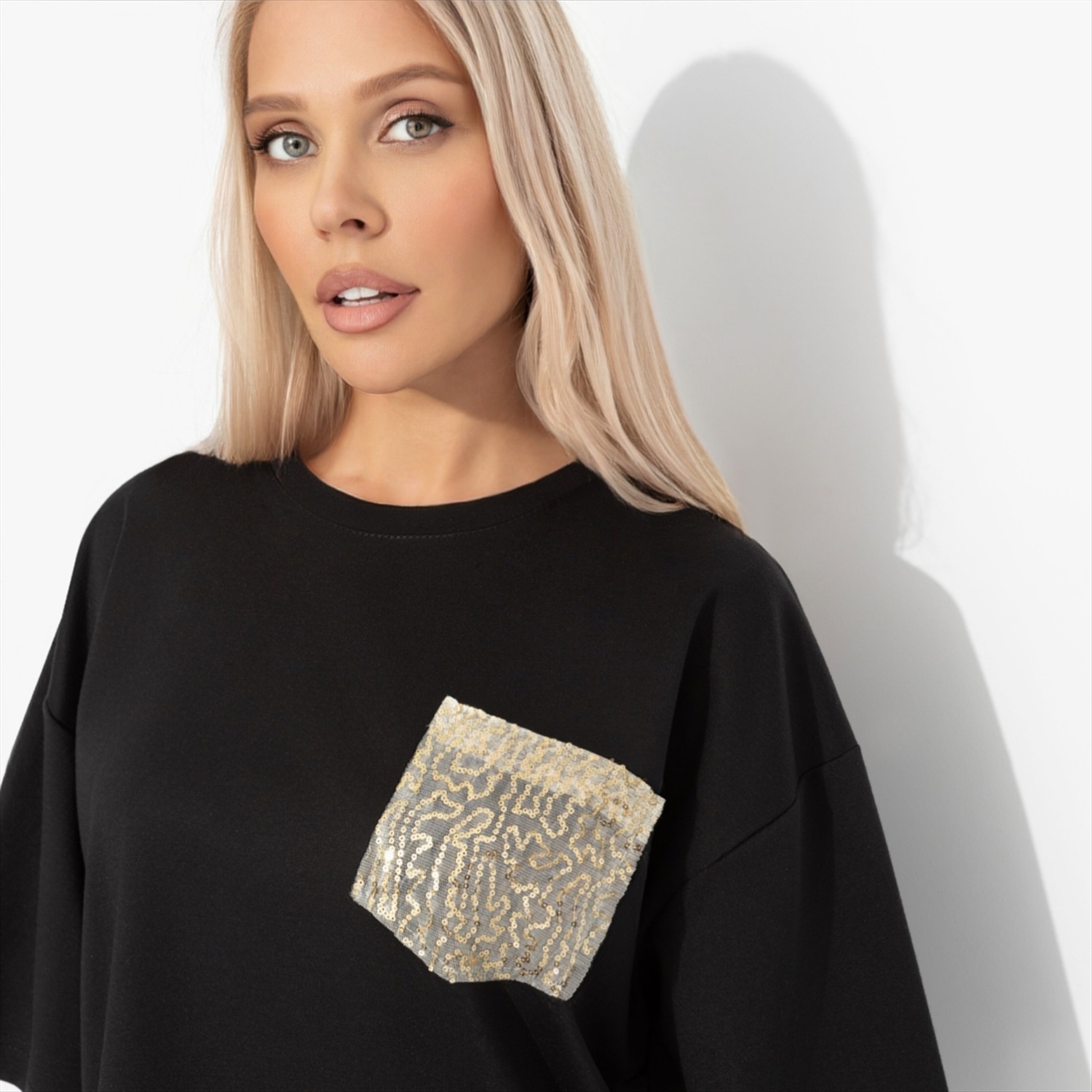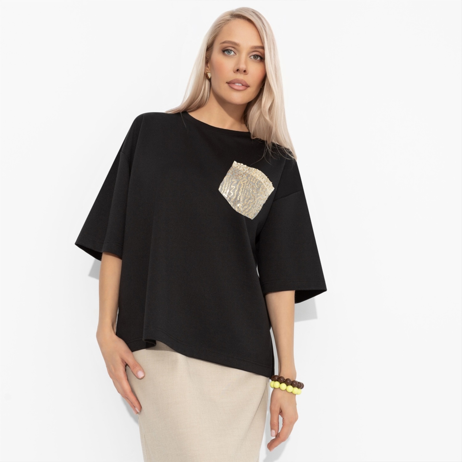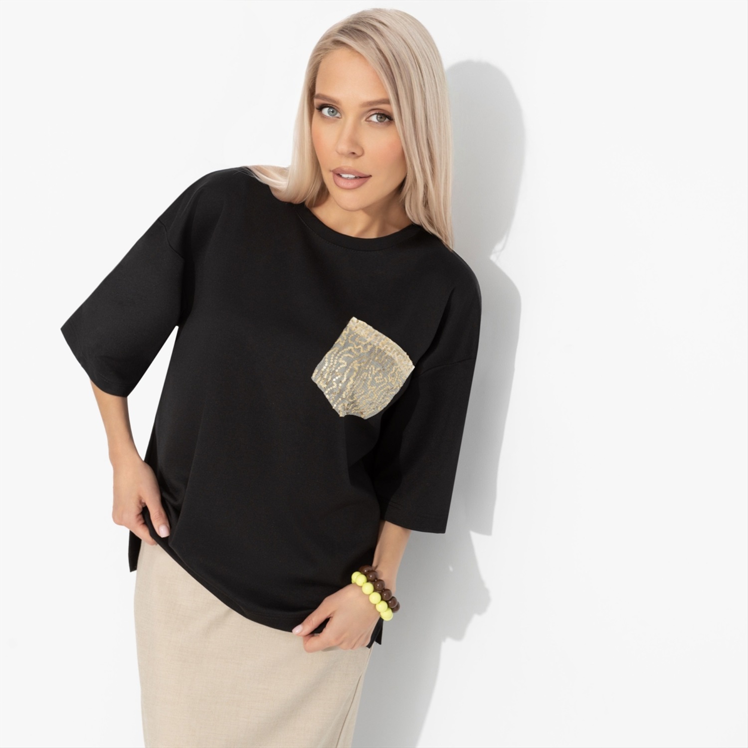 Футболка ЧАРУТТИ — непринужденная и уютнаябаза для образа. Играющая бликами деталь из пайеток мгновенно делает лук нарядным и подходящим для вечеринки. Сочетай ее с джинсами-скинни или кожаными шортами для дерзкого впечатления. Футболка удлиненная свободного кроя. Акцентная деталь — карман по передней стороне изделия из сетки с пайетками. Пайетки прошиты. Изделие хорошо смотрится в заправленном виде и навыпуск.