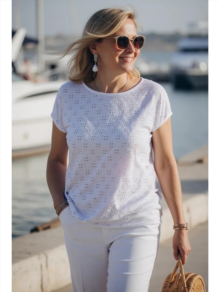 Состав: вискоза 70%, полиэстер 20%, спандекс 10% Модель: Футболка летняя ажурная WF/01 Тип товара: футболка Материал: вискоза | полиэстер | спандекс | полиэстер | спандекс | вискоза Бренд: Di colore Рисунок: крапинка | однотонные | рубчик Рукав: короткий рукав Сезонность: лето Силуэт: свободный Стиль: повседневный Летняя женская футболка с коротким рукавом от DiColore станет отличным дополнением к вашему гардеробу. Выполненная из легкой и дышащей вискозы, она прекрасно подходит для летнего сезона. Ажурная ткань с перфорацией обеспечивает отличную вентиляцию, что делает её идеальным выбором для жарких дней. Белый цвет придаёт свежесть вашему образу, а спущенное плечо добавляет нотку стильности и расслабленности. Белая ажурная блузка создает легкий и воздушный образ, свободная посадка не стесняет движений. Удобная базовая модель позволяет сочетать ее с джемпером, пиджаком или другими верхними слоями. Футболка универсальна: её можно носить как в офисе, так и на каждый день. Праздничный вариант также возможен достаточно дополнить её аксессуарами. Эта блузка подойдет для любого типа фигуры и станет отличным выбором для создания разнообразных образов, позволяя вам оставаться модной и уверенной в себе. Уход за футболкой достаточно прост: достаточно слегка постирать и прополоскать ее в теплой воде, не выкручивать для сохранения формы ткани, высушить в расправленном виде. Можно обойтись без утюга. Размерная таблица производителя находится на фото в карточке товара и позволяет правильно выбрать размер. Таблица размеров и веса