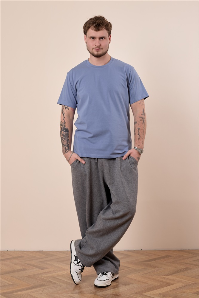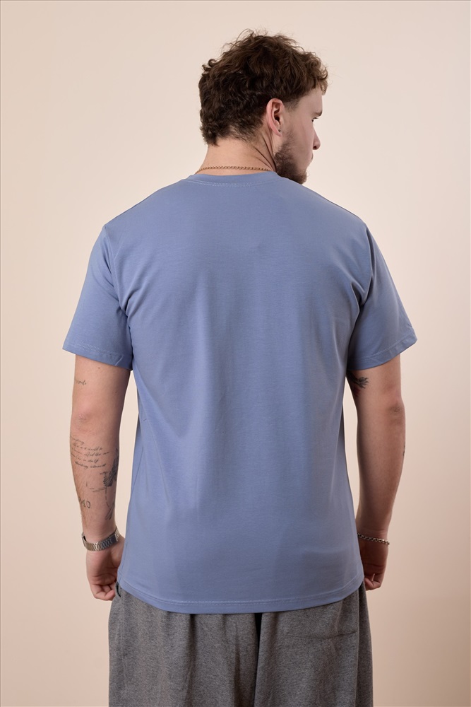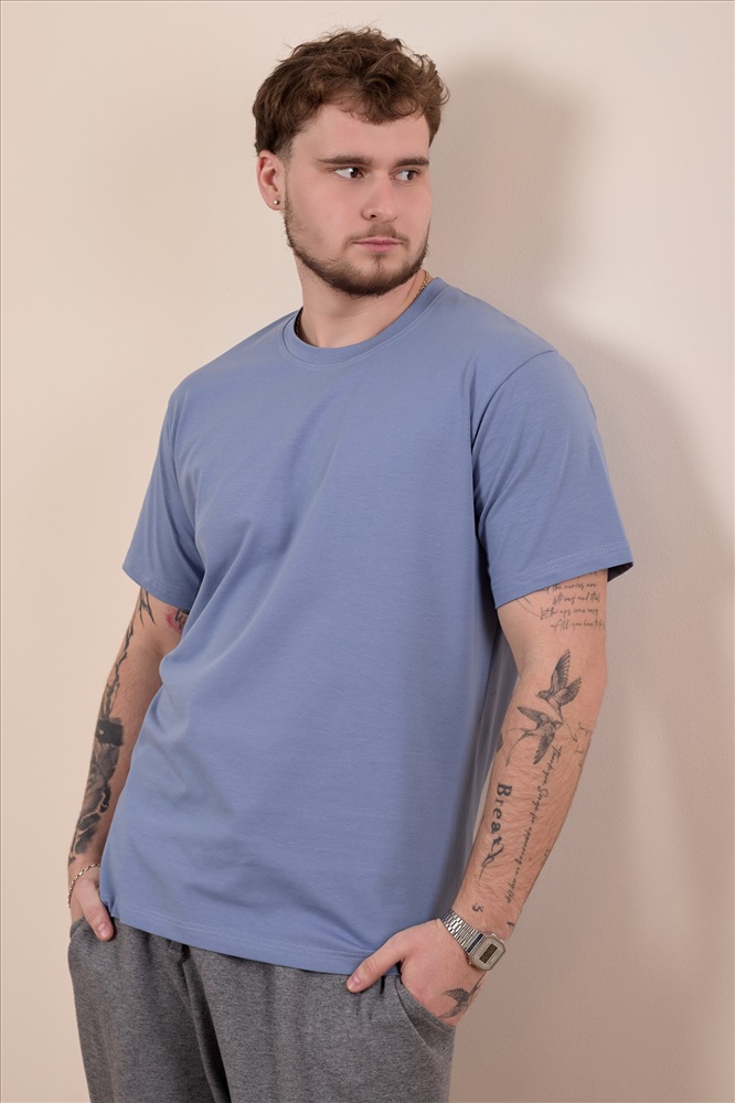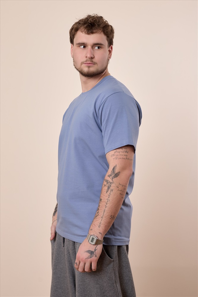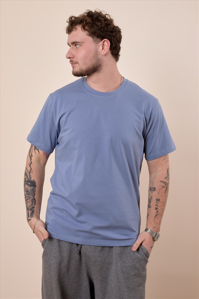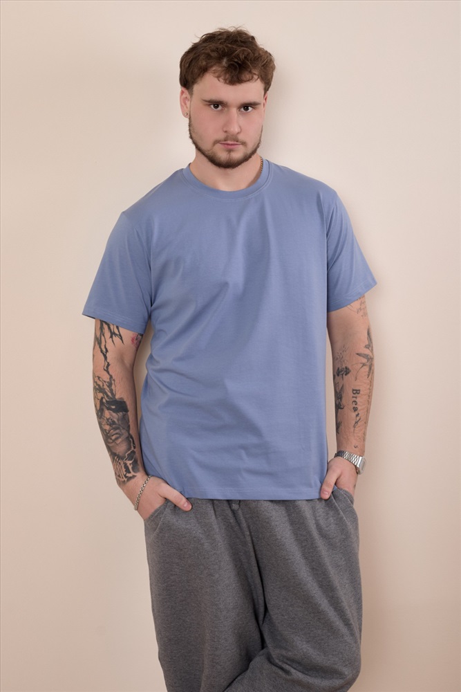 Сезон: Всесезонный Силуэт: Свободный Состав: Хлопок 95% Лайкра 5% Цвет Номенклатуры: индиго Мужская футболка свободного силуэта выполнена из однотонного х/б полотна с лайкрой. Рукав короткий, втачной, горловина имеет круглый вырез. Комментарии к товару