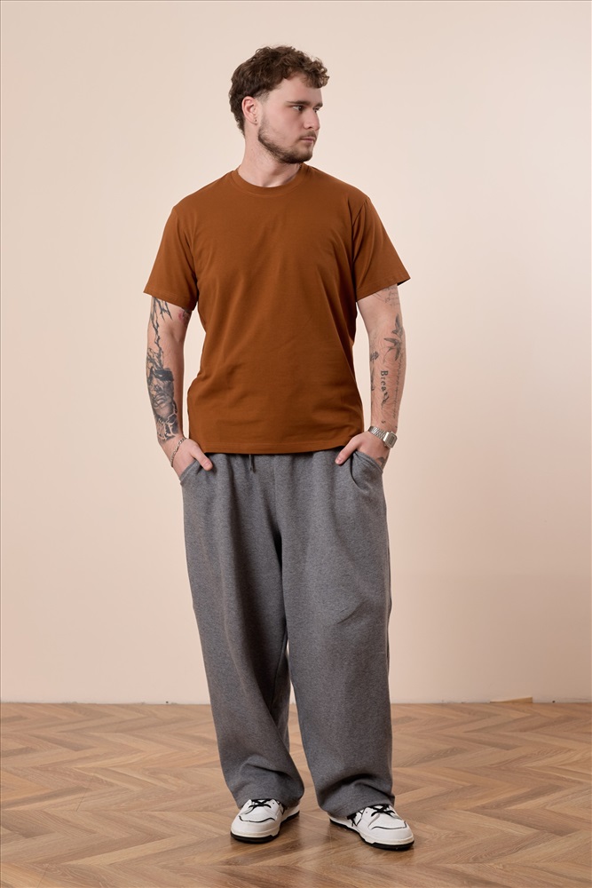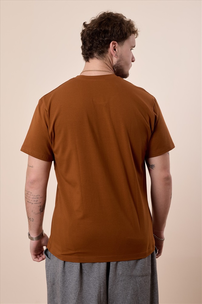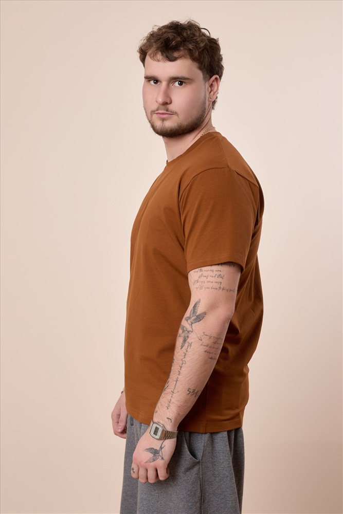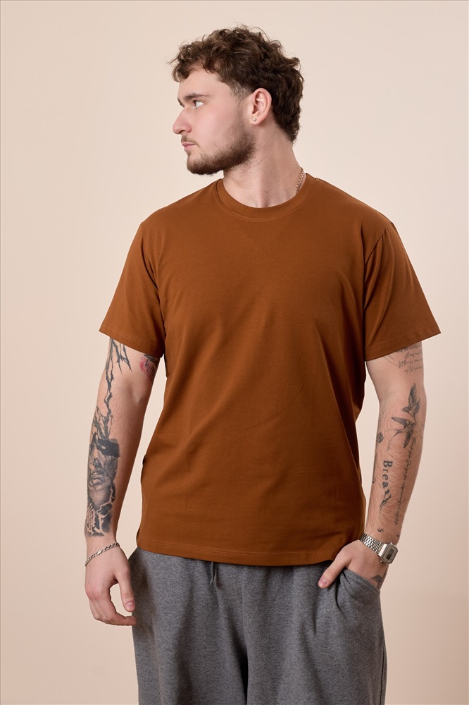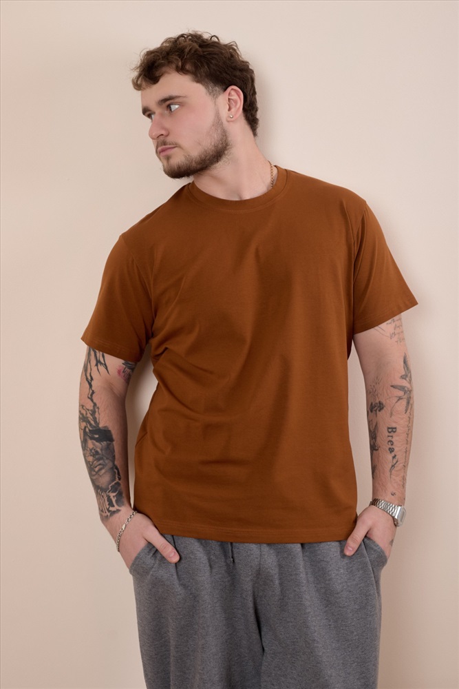 Сезон: Всесезонный Силуэт: Свободный Состав: Хлопок 95% Лайкра 5% Цвет Номенклатуры: коричневый Мужская футболка свободного силуэта выполнена из однотонного х/б полотна с лайкрой. Рукав короткий, втачной, горловина имеет круглый вырез. Комментарии к товару