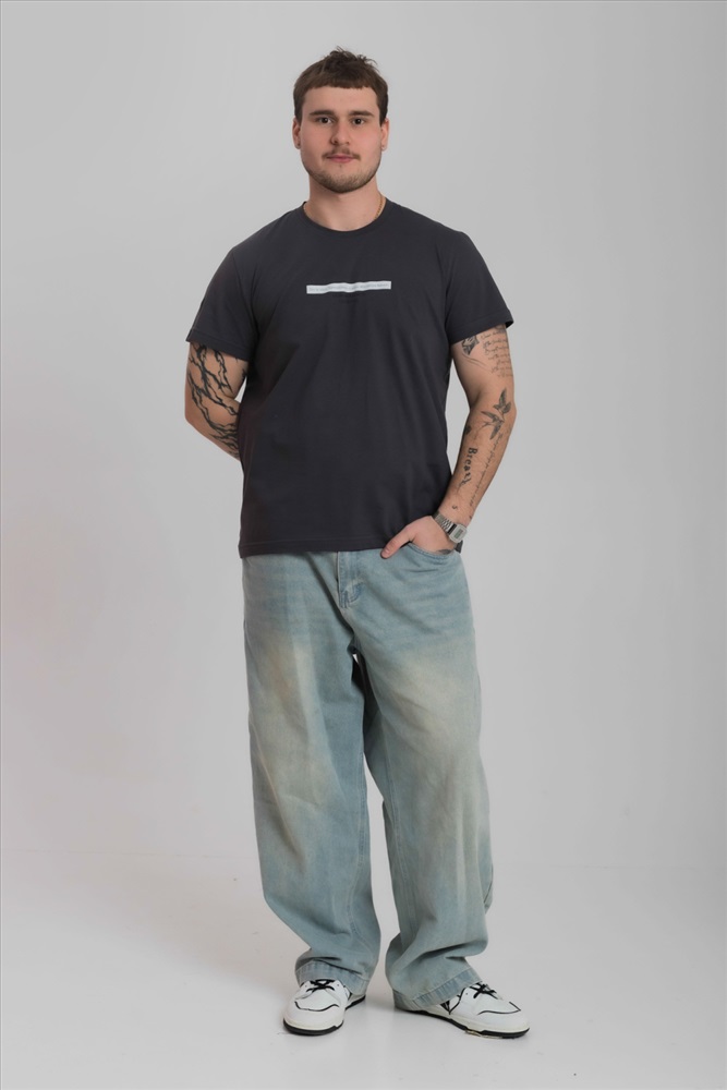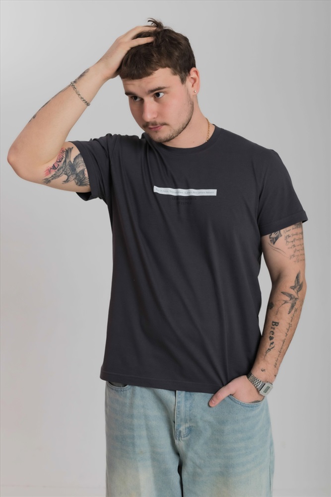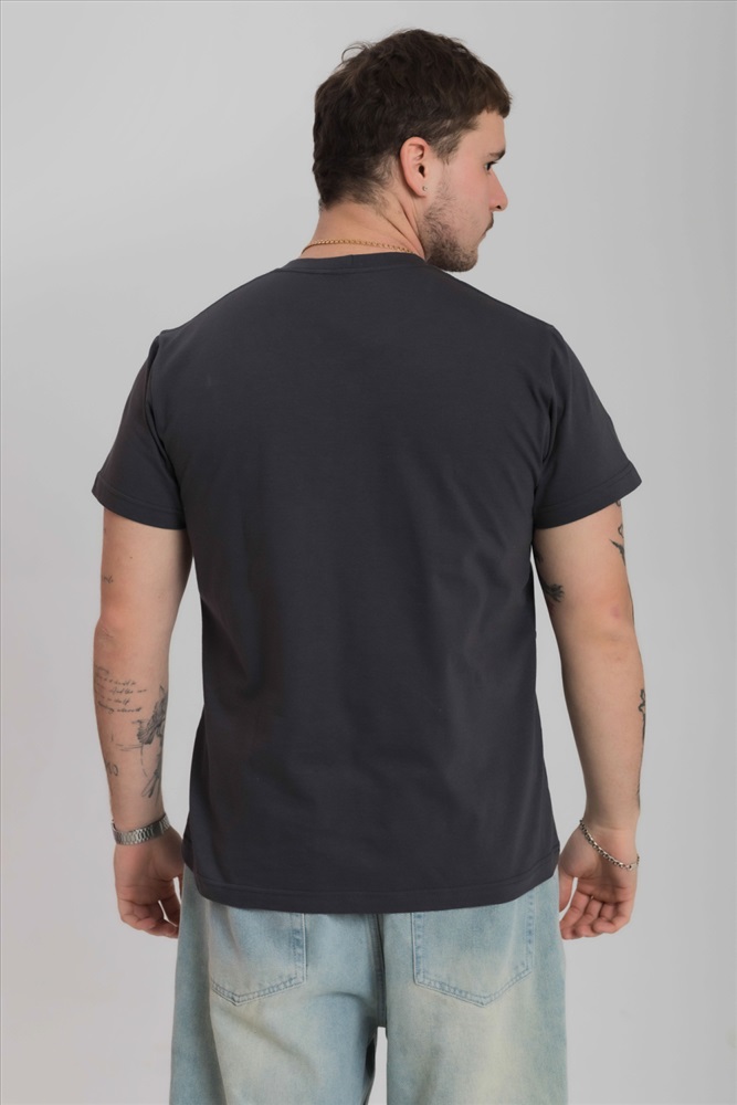 Сезон: Всесезонный Силуэт: Свободный Состав: Хлопок 100% Цвет Номенклатуры: темно-серый Футболка мужская, выполнена из однотонной хлопковой ткани. Свободного кроя, короткий рукав. Горловина с круглым вырезом, отделанным планкой. Спереди нанесён принт. Комментарии к товару