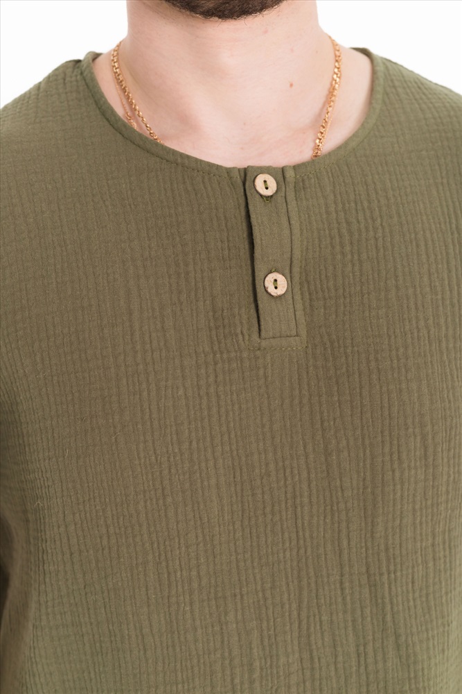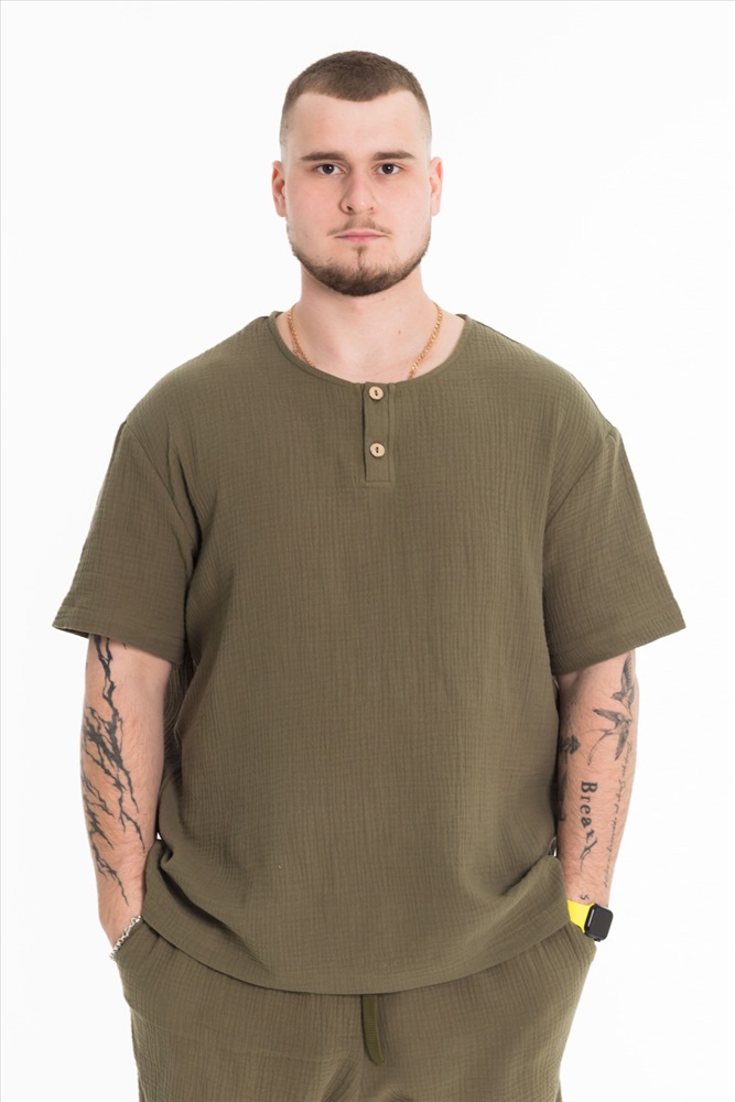 Сезон: Летний Силуэт: Свободный Состав: Хлопок 100% Цвет Номенклатуры: темный хаки Мужская футболка выполнена из хлопкового полотна - муслина. Силуэт футболки свободный, линия плеча спущена. Круглый вырез горловины с застёжкой на две пуговицы, низ футболки разноуровневый. Комментарии к товару