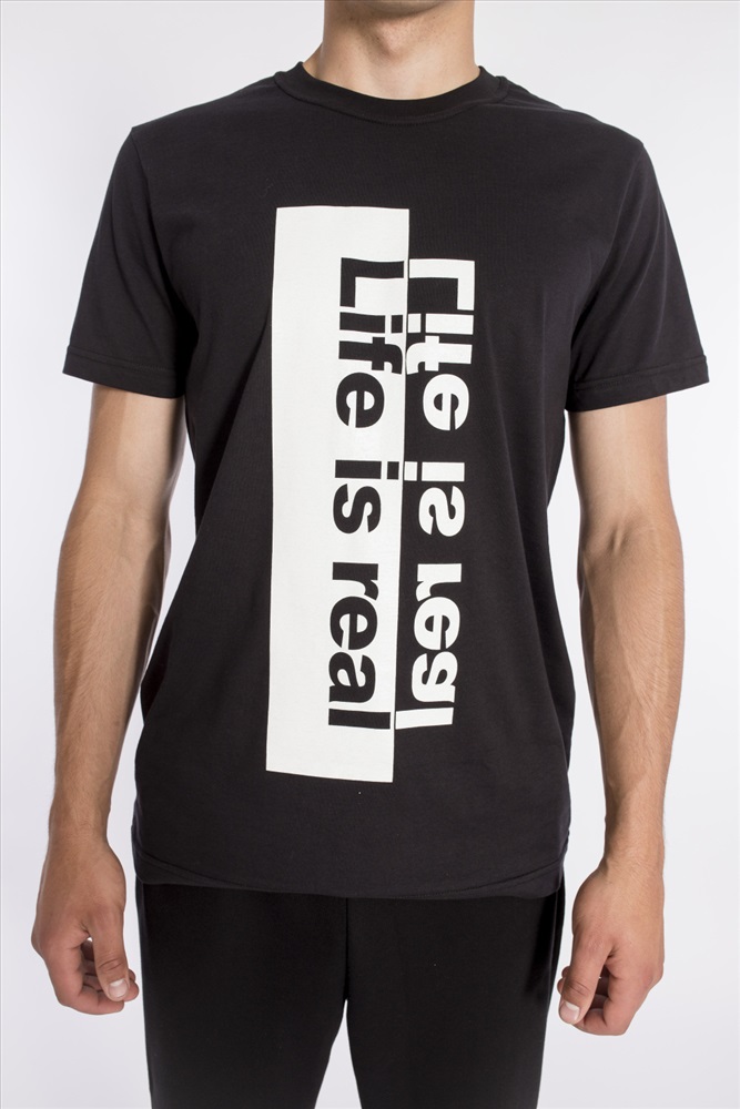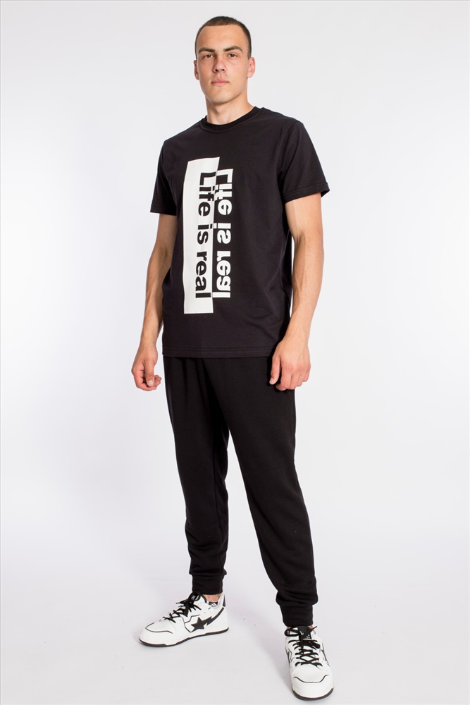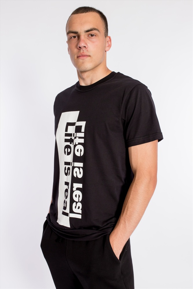 Футболка свободного силуэта из однотонного х/б полотна. Футболка с коротким рукавом, планка круглого выреза горловины выполнена из рибаны. Спереди нанесён принт.