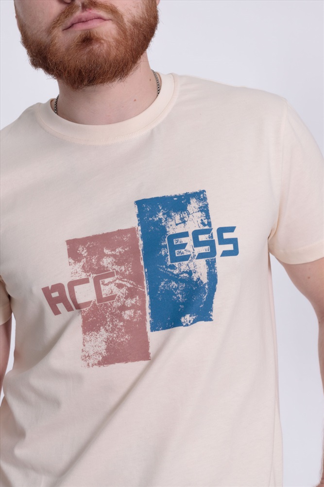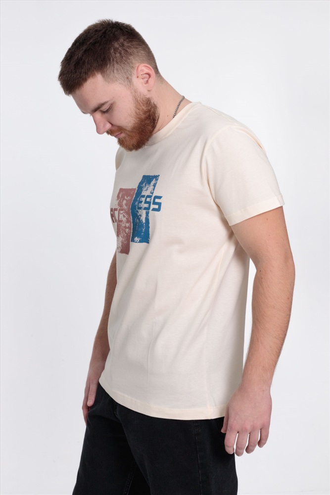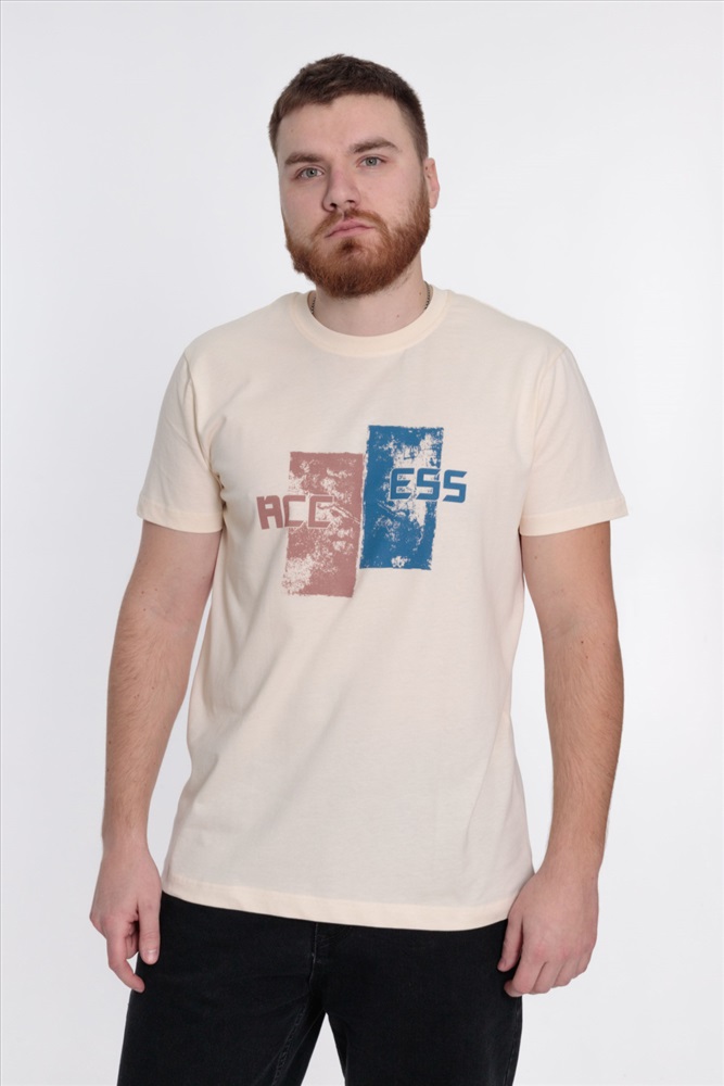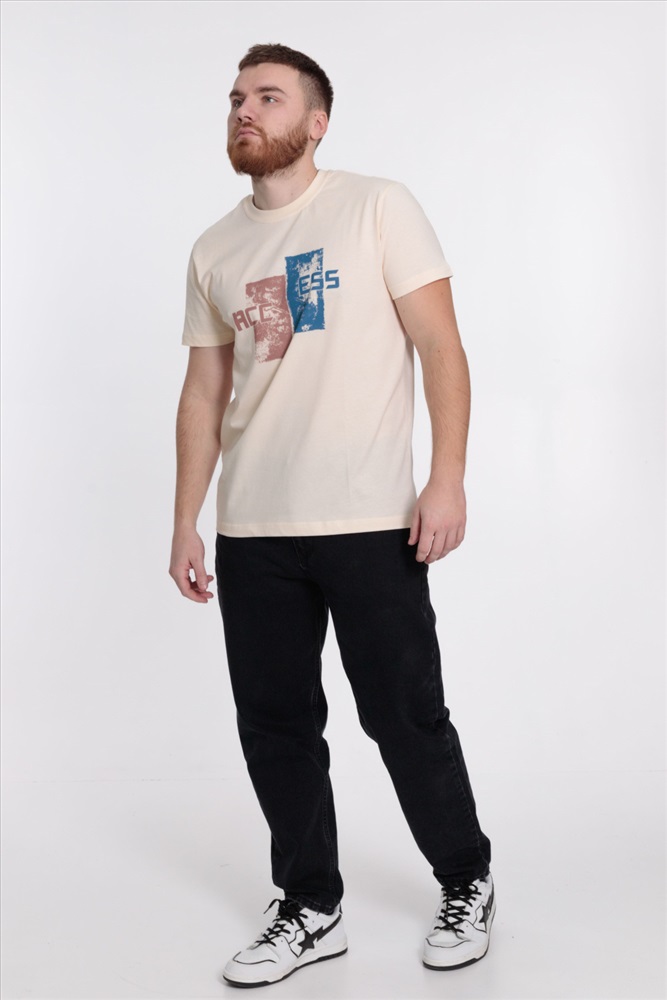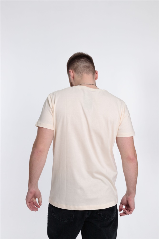 Сезон: Всесезонный Силуэт: Свободный Состав: Хлопок 100% Цвет Номенклатуры: молоко Футболка мужская, выполнена из однотонной хлопковой ткани. Свободного кроя, короткий рукав. Горловина с круглым вырезом, отделанным планкой. Спереди нанесён принт. Комментарии к товару