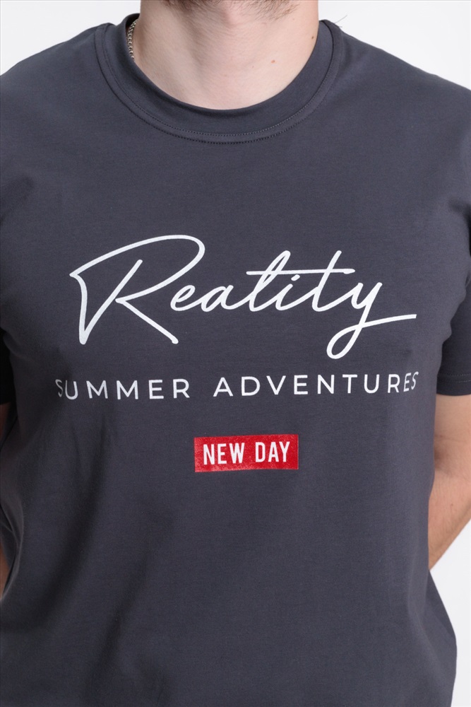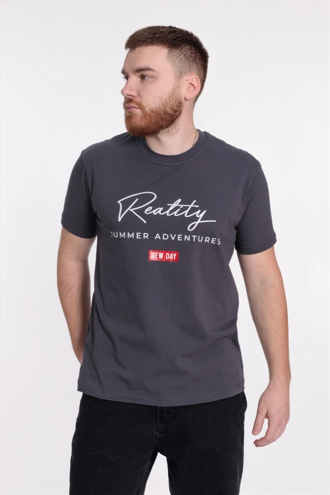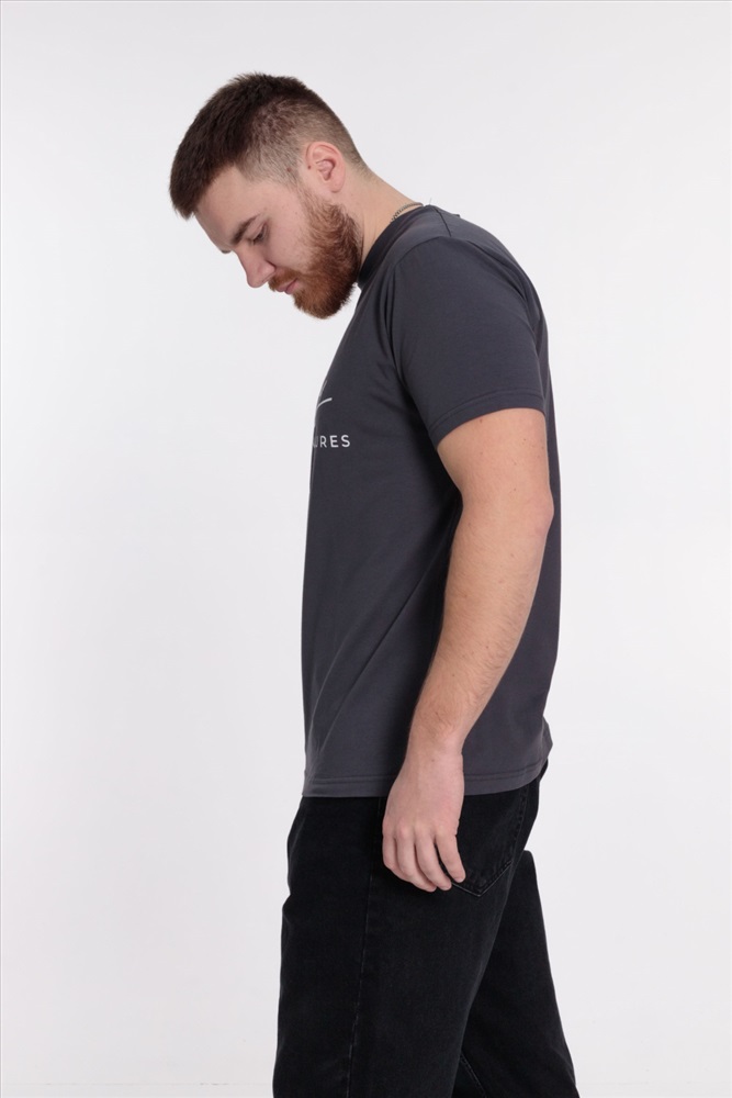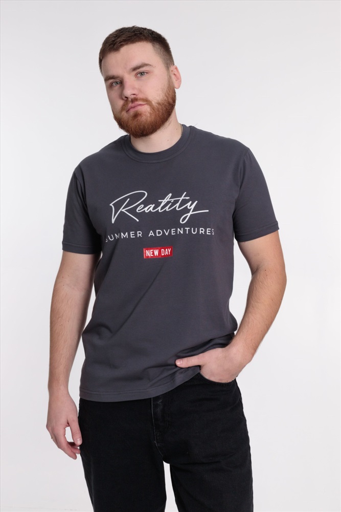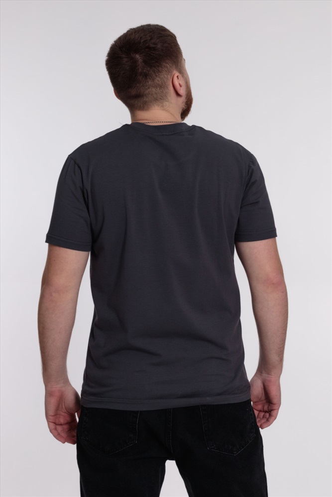 Сезон: Всесезонный Силуэт: Свободный Состав: Хлопок 95% Лайкра 5% Цвет Номенклатуры: темно-серый Мужская футболка выполнена из однотонного х/б полотна с лайкрой. Круглый вырез горловины оформлен планкой, рукава короткие. Спереди нанесён принт. Комментарии к товару