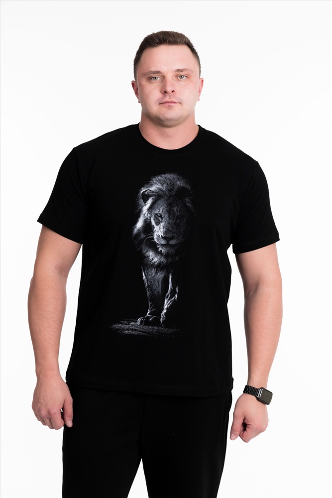 Мужская футболка свободного силуэта выполнена из однотонного х/б полотна с лайкрой. Рукав короткий, втачной, горловина имеет круглый вырез. Спереди нанесён принт.